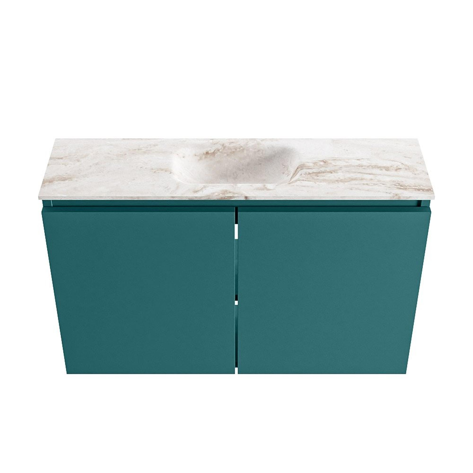 Le meuble, dans la couleur Smag – une teinte moderne tirant sur le vert – forme une base particulièrement esthétique pour le lavabo Eden beige dans la couleur Frappe. Cette combinaison paraît chaleureuse, raffinée et contemporaine, et se marie facilement avec des robinets et accessoires noirs, chromés ou en métal brossé. Les couleurs calmes et naturelles s’intègrent parfaitement dans des toilettes ou une salle de bains modernes dans lesquelles vous souhaitez créer une ambiance d’hôtel chic sans que cela devienne trop voyant ou chargé. Grâce à la finition sans poignées, la façade reste épurée et minimaliste, ce qui donne à l’ensemble une allure encore plus luxueuse.