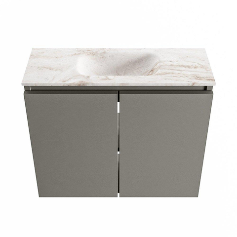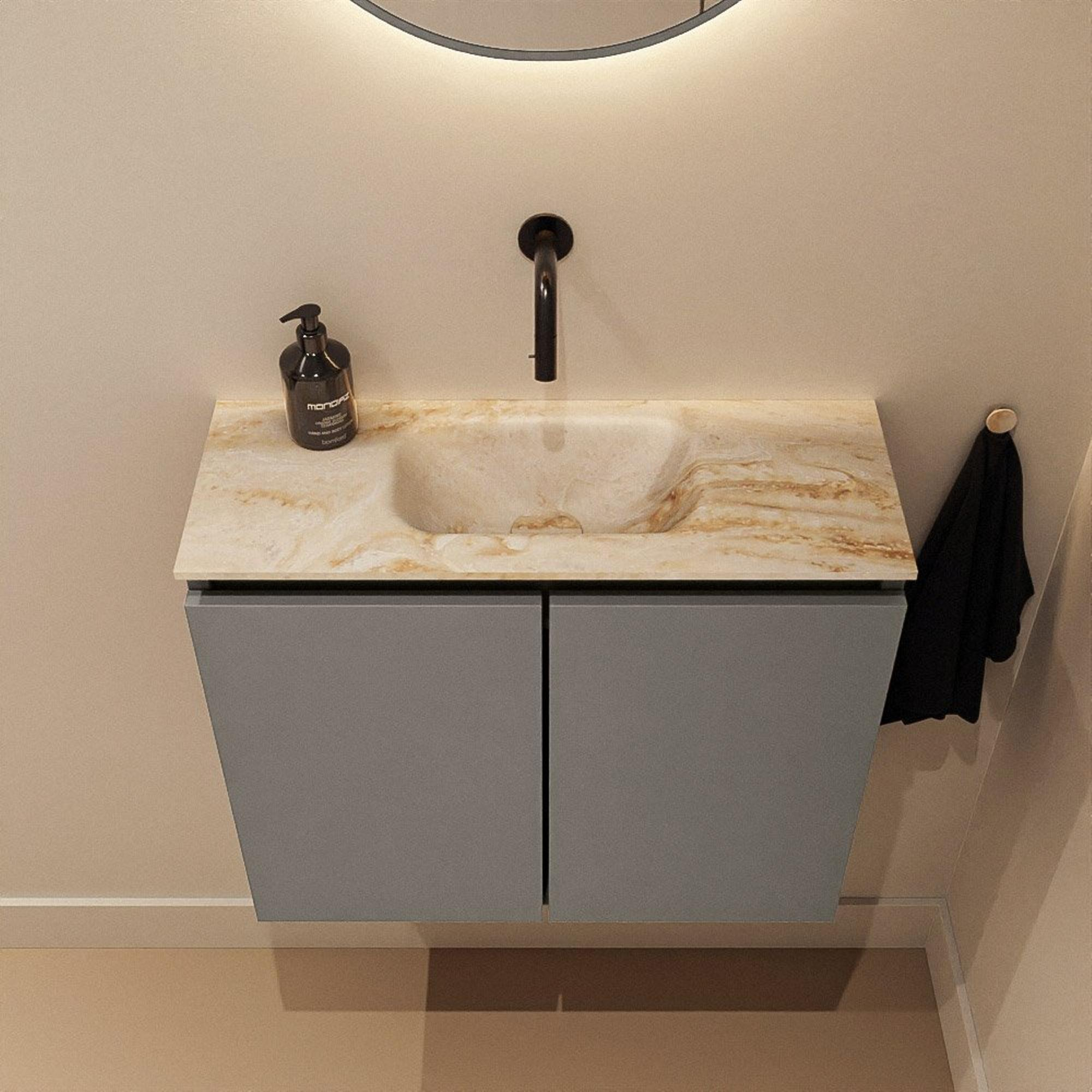 Le caisson dans la couleur Smoke - un ton anthracite/gris fumé profond - donne immédiatement à vos toilettes une apparence moderne et luxueuse. Le plan vasque Frappe beige chaud forme un contraste subtil : suffisamment clair pour paraître frais, mais plus doux qu’un blanc froid, de sorte que la pièce reste accueillante et chaleureuse. Cette combinaison s’accorde parfaitement avec les tendances actuelles de salles de bains utilisant des matériaux naturels, des carreaux effet béton ou des robinets noirs. Grâce à la finition sans poignées, la façade reste sobre et linéaire, sans interruption dans le jeu de lignes. Il en résulte un ensemble intemporel que vous pouvez facilement associer à des accessoires noirs, chromés ou en métal brossé, par exemple.