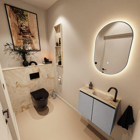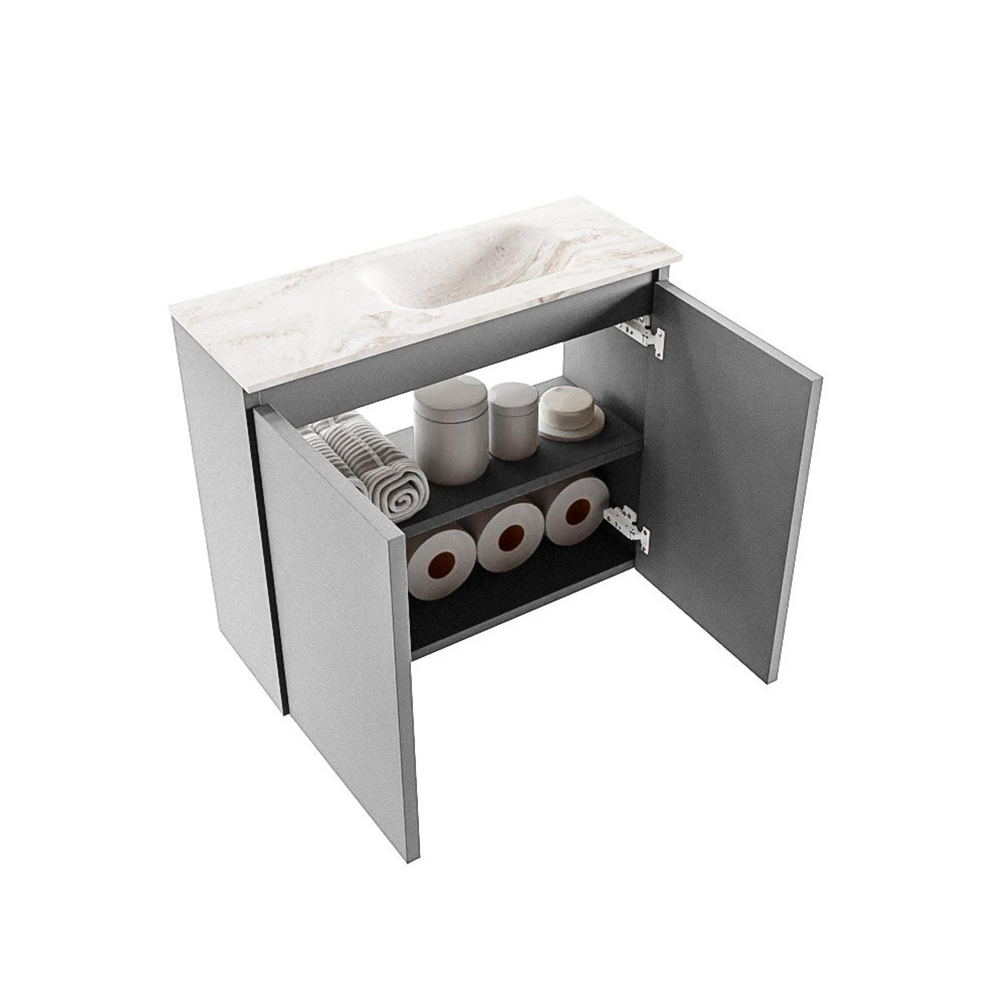 Vous cherchez un meuble compact et moderne qui s’intègre parfaitement dans une petite salle de bains, des toilettes ou une niche étroite, sans compromis sur le confort et l’esthétique ? Alors ce meuble de toilette peu profond avec vasque intégrée est un choix particulièrement astucieux. Grâce à sa faible profondeur, il donne une impression d’espace plus grand et vous permet de vous mouvoir aisément, même dans un petit espace WC. La combinaison d’un meuble épuré sans poignées dans une teinte grise moderne et d’un plan vasque solide dans une couleur Frappe beige et chaleureuse crée un aspect contemporain et luxueux. Grâce au trou de robinet et au bassin situés sur le côté droit, ce meuble est idéal lorsque votre installation de tuyauterie ou votre sens de circulation l’exige, par exemple le long d’un mur court ou à côté de la porte. Vous créez ainsi un ensemble fonctionnel et élégant, parfaitement adapté à votre utilisation quotidienne.