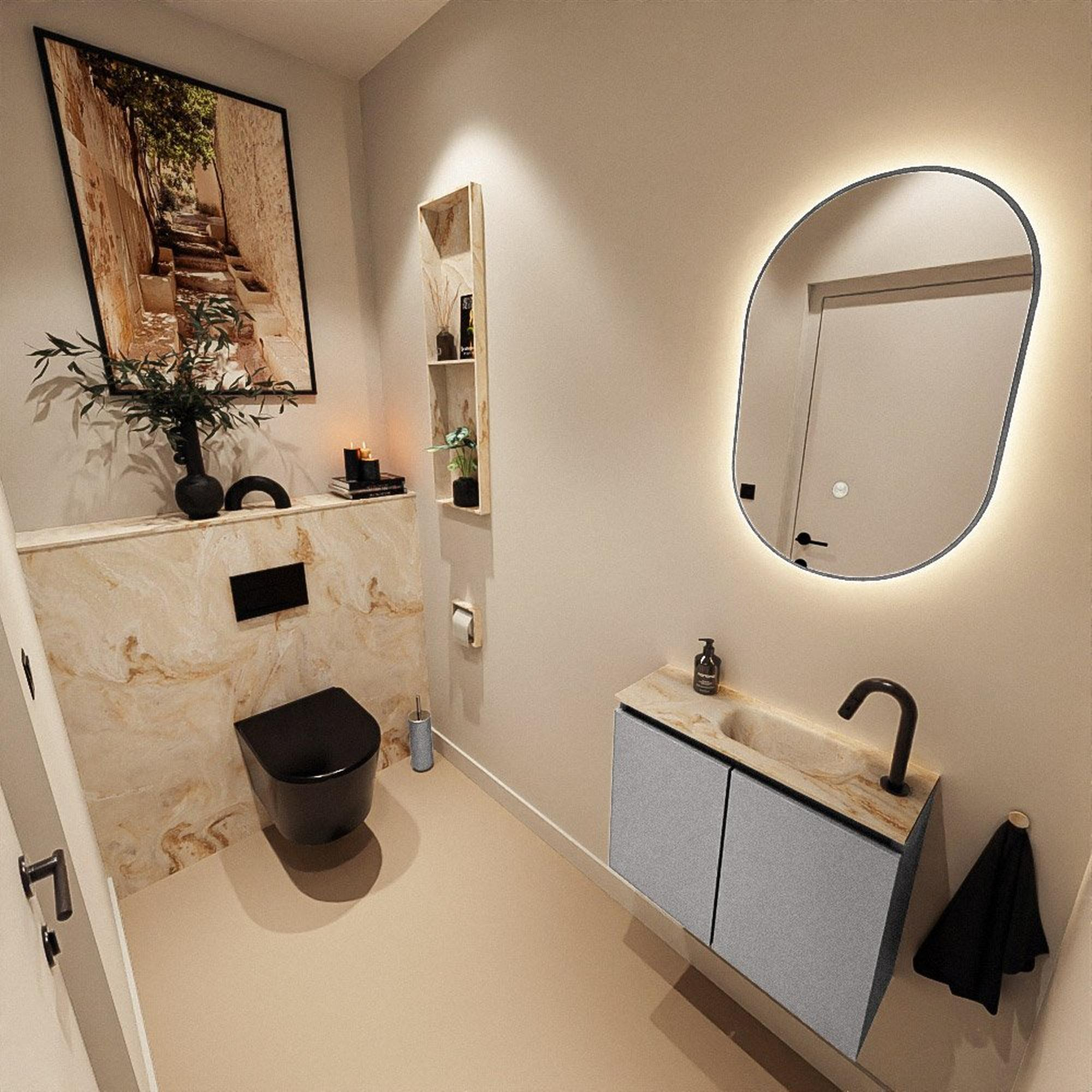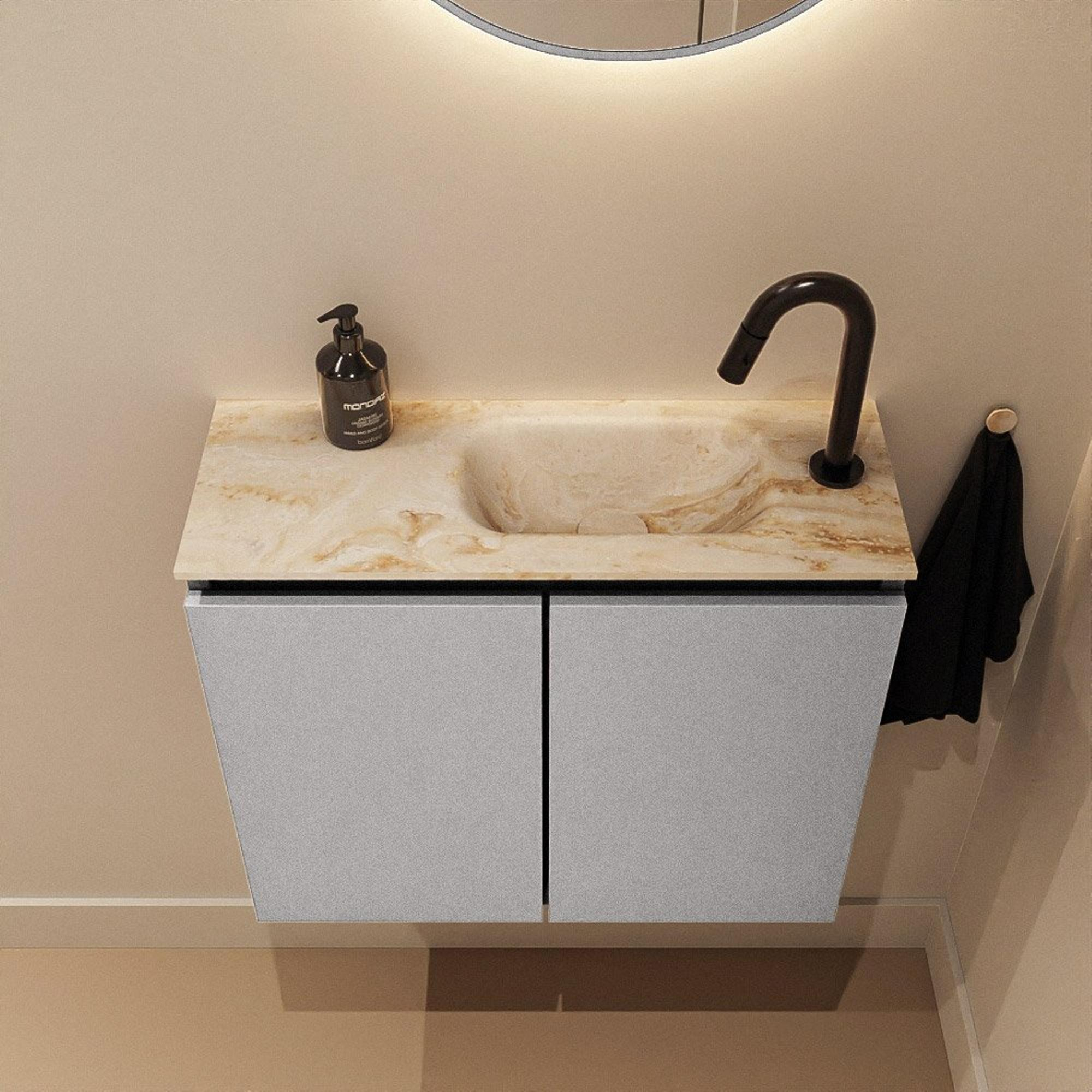 Le style moderne de ce meuble se reflète dans les lignes épurées, les façades sans poignées et la palette de couleurs contemporaine. Le meuble en coloris Plata, une teinte de gris raffinée, forme un joli contraste avec le plan vasque Frappe beige. Cette combinaison paraît chaleureuse et luxueuse et se marie facilement avec des robinets et accessoires noirs, chromés ou en métal brossé. Le design sans poignées renforce le look minimaliste et donne à la façade un aspect calme et épuré, ce qui fait toute la différence dans un petit espace. Vous créez ainsi, avec un seul meuble, une base réfléchie pour un ensemble moderne de toilette ou de salle de bains, qui se combine aisément avec d’autres éléments, comme un miroir assorti ou une applique murale discrète.