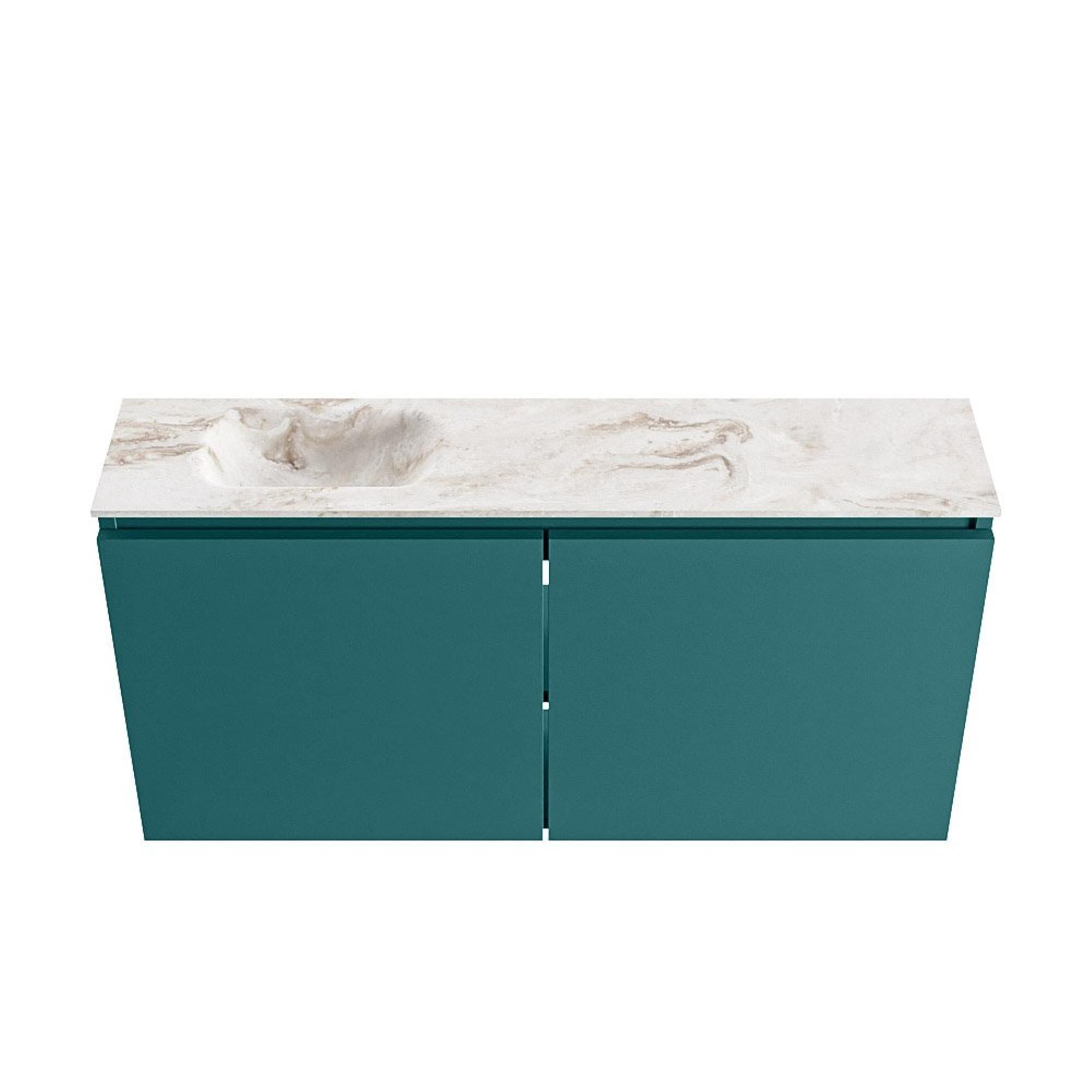 Avec ce meuble WC compact, vous créez en une seule fois une combinaison réfléchie de design et de fonctionnalité dans vos toilettes ou petite salle de bains. La faible profondeur rend le meuble idéal pour les espaces compacts où chaque centimètre compte, tandis que le large plan de 100 cm offre néanmoins suffisamment de place pour vous laver les mains confortablement et poser quelques accessoires. Grâce aux façades modernes sans poignées, l’ensemble paraît épuré et ordonné, et derrière les deux portes vous rangez sans effort rouleaux de papier toilette, produits d’entretien et autres indispensables hors de vue. La combinaison du meuble vert chaud et de la douce couleur Frappe du lavabo s’accorde parfaitement avec les intérieurs modernes et scandinaves, mais trouve aussi sa place dans un style classique contemporain. Si vous recherchez une solution élégante et gain de place avec un lavabo en solid surface de haute qualité et une disposition pratique, ce meuble est alors un choix particulièrement judicieux.