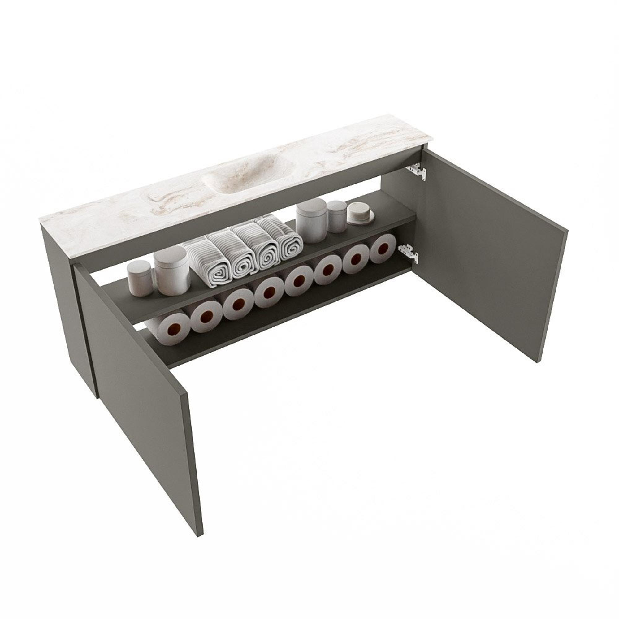 Avec une largeur de 120 cm et une profondeur de seulement 23 cm, ce meuble est une solution idéale pour les toilettes étroites et les petites salles de bains. Vous profitez d’un plan généreux et d’un lavabo confortable, tout en conservant suffisamment d’espace de circulation. La teinte fumée, proche de l’anthracite, crée une base élégante qui se marie facilement avec des robinets et accessoires noirs, chromés ou en métal brossé. L’exécution sans poignées renforce le caractère minimaliste : aucune ligne perturbatrice, mais une façade continue et épurée. Ainsi, avec peu d’éléments, vous créez tout de même une atmosphère haut de gamme et design dans votre espace.