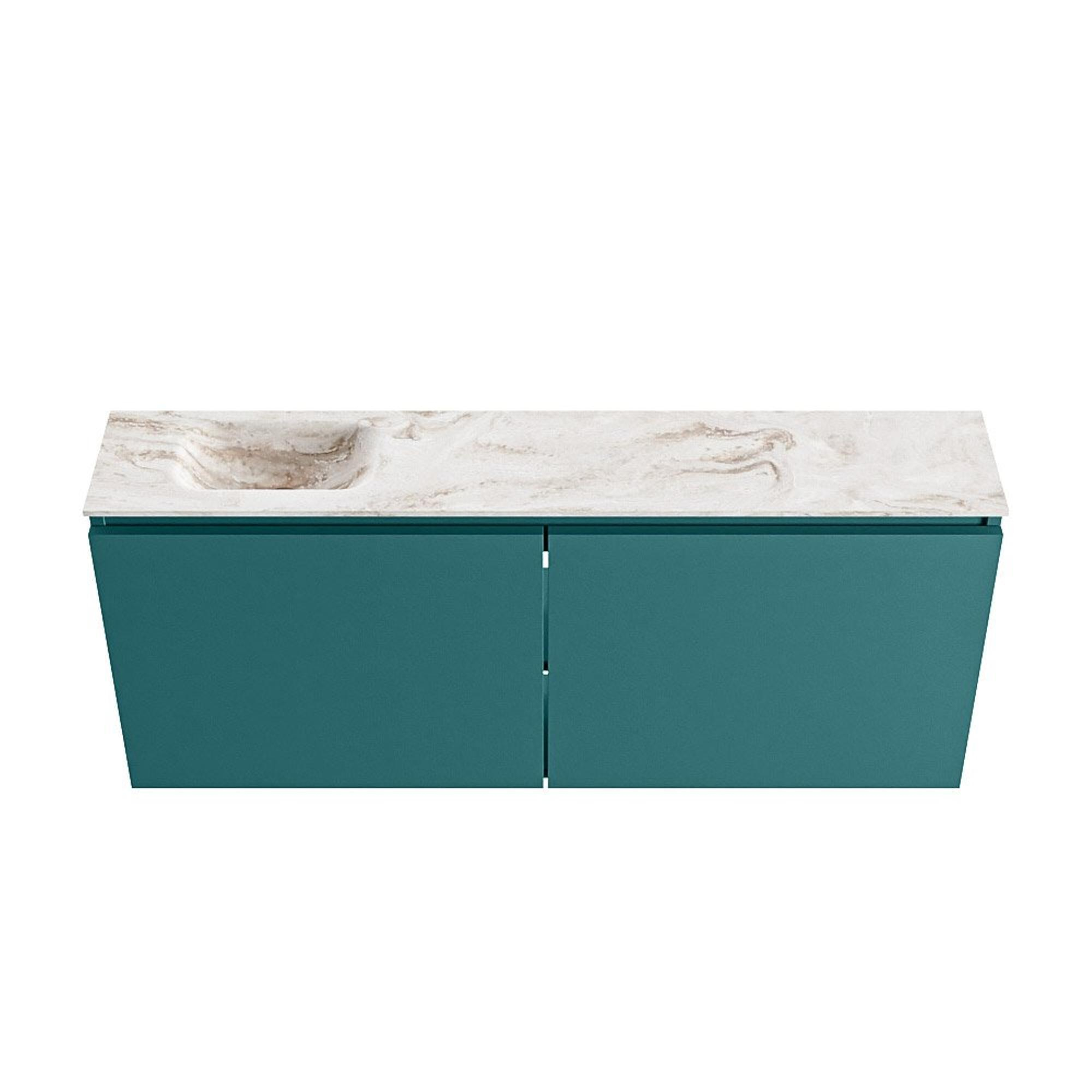 La combinaison de la faible profondeur de 23 cm et de la grande largeur de 120 cm offre à votre mur un meuble continu et épuré, sans empiéter sur l’espace de passage. La couleur verte Smag a un aspect moderne et raffiné, et forme un beau contraste avec la vasque Frappe claire au look marbré. Comme le meuble est sans poignées, les façades restent sobres et minimalistes, ce qui confère immédiatement à vos toilettes une ambiance luxueuse digne d’un hôtel. La vasque est positionnée à gauche, ce qui laisse à droite un large plan idéal pour la décoration, un distributeur de savon ou un ensemble de serviettes invité. Vous créez ainsi avec un seul meuble un ensemble complet et équilibré le long du mur.