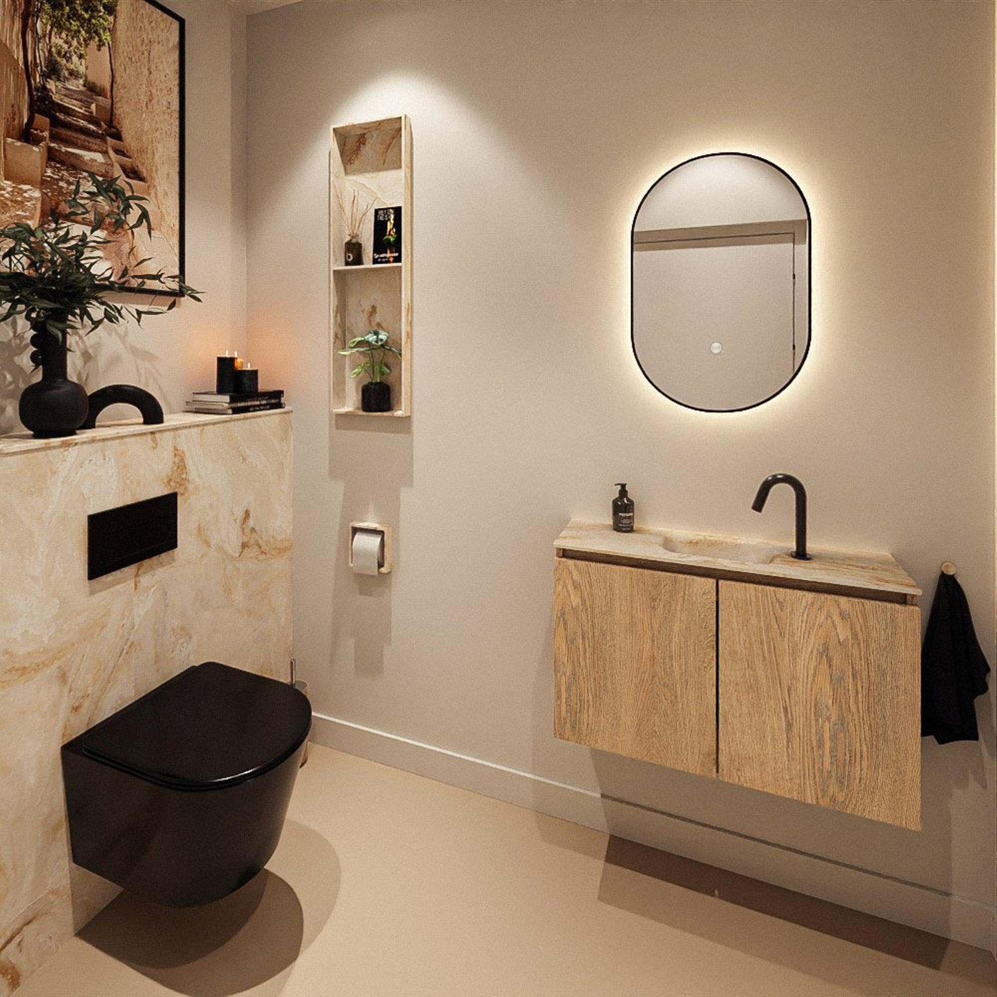 La combinaison de la teinte bois Washed Oak avec le lavabo Frappe confère un aspect contemporain et luxueux qui s’intègre parfaitement dans les salles de bains et toilettes modernes. Le décor bois apporte chaleur et atmosphère, tandis que le lavabo Frappe beige crée un contraste subtil et procure une sensation de spa luxueuse sans être tape-à-l’œil. Grâce à la conception sans poignées, la façade paraît épurée et minimaliste ; idéal si vous aimez les lignes calmes et régulières. Les teintes neutres se marient facilement avec des robinets et accessoires noirs, chromés ou en métal brossé, ce qui vous permet de décliner aisément votre style personnel dans toute la pièce.