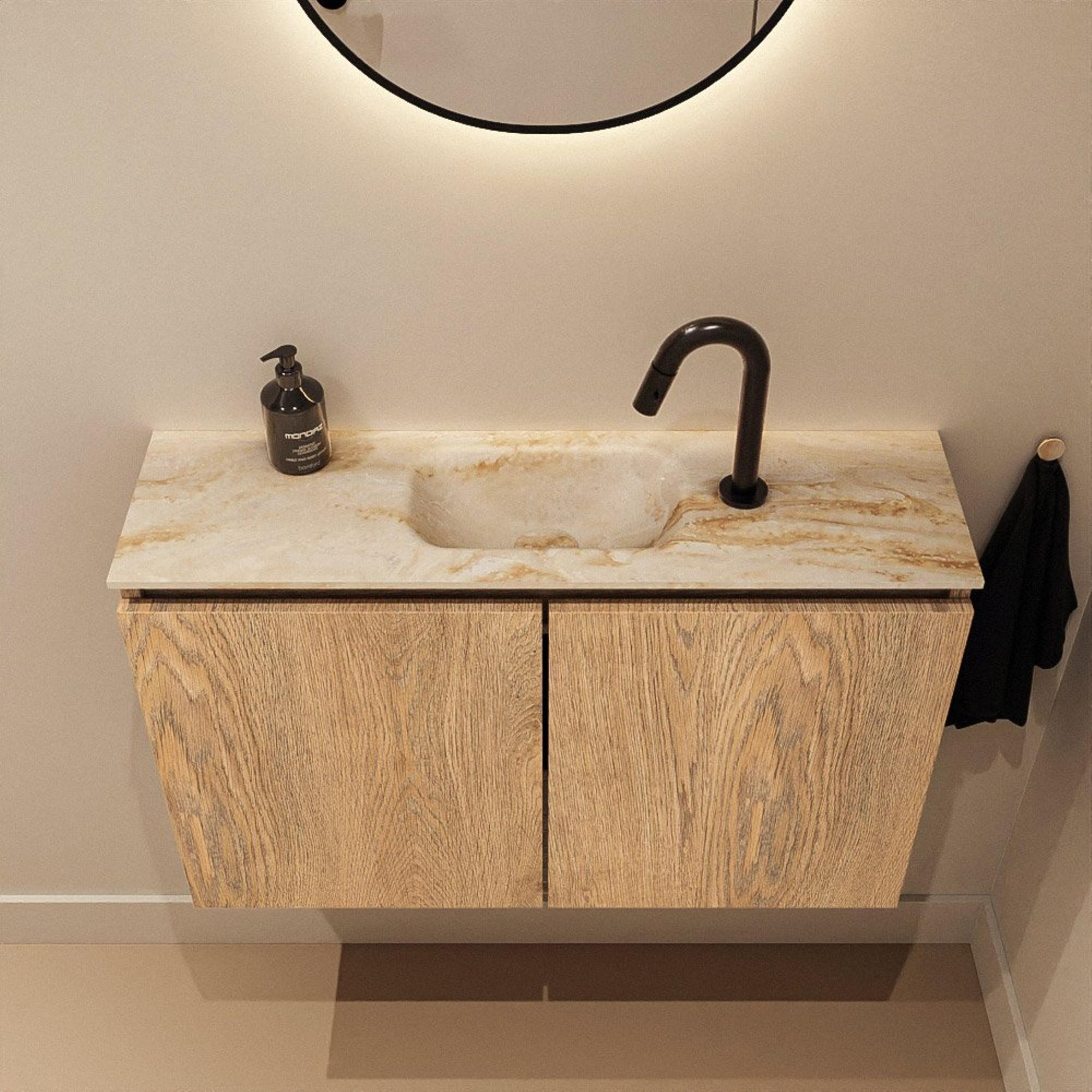 MONDIAZ TURE-DLUX Meuble WC 80 cm Washed Oak. Lavabo EDEN Frappe position milieu. Avec 1 trou de robinet.