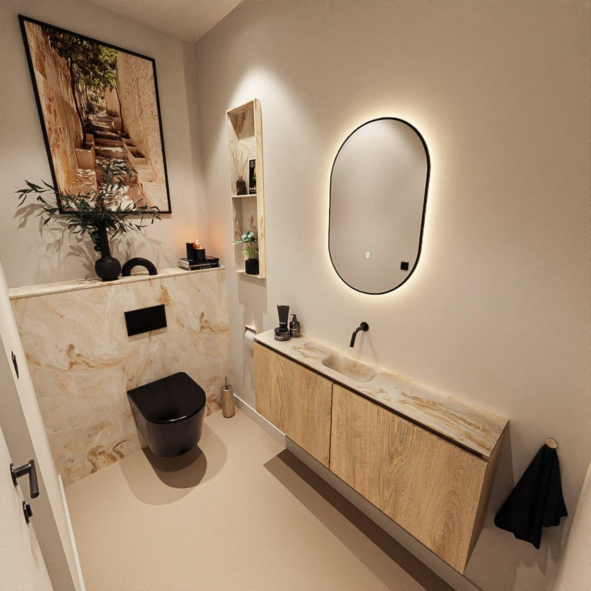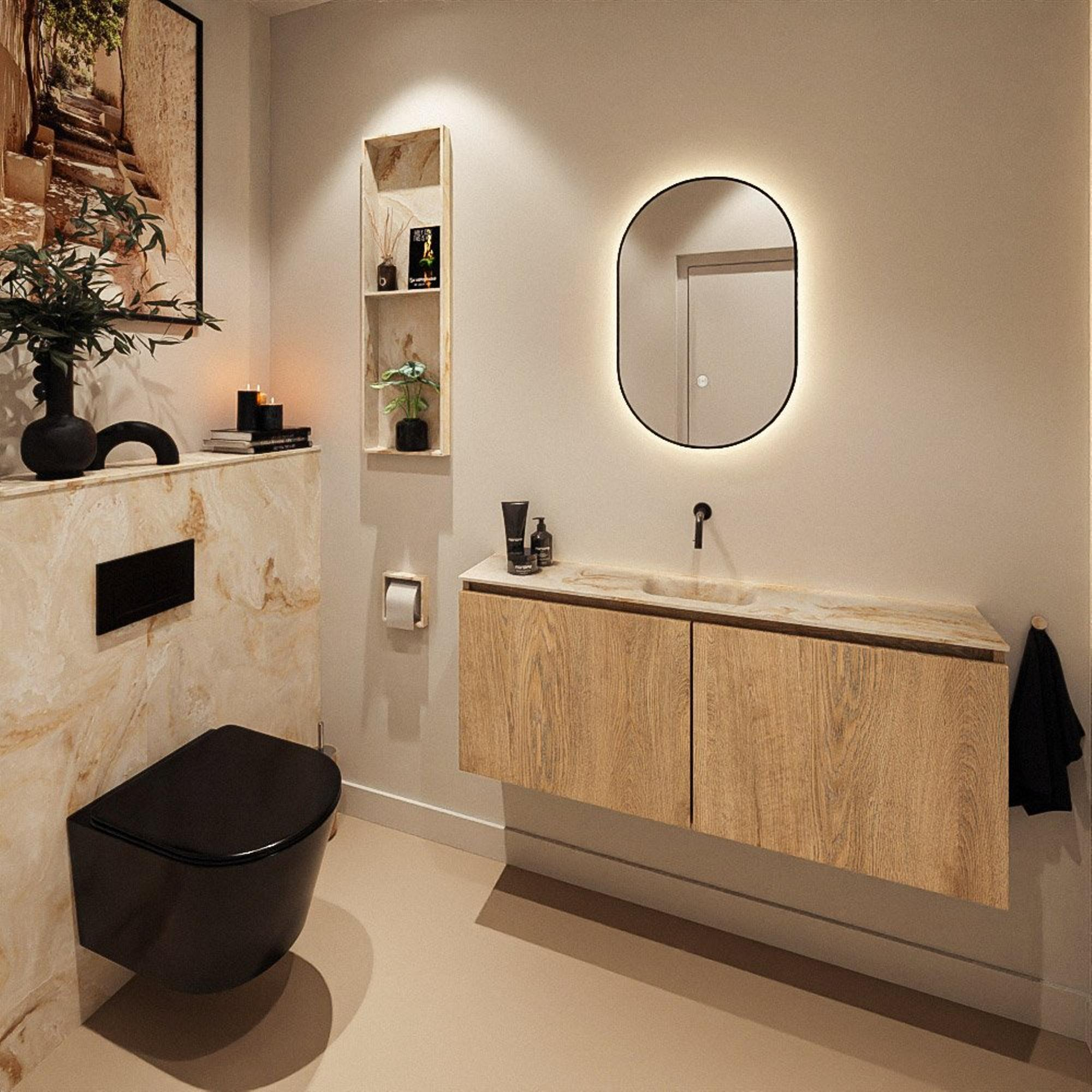 Vous recherchez un meuble WC fin et élégant qui prend peu de profondeur tout en offrant un lavabo à part entière ? Alors cet ensemble compact est un choix judicieux. Grâce à ses dimensions peu profondes, ce meuble est idéal pour les toilettes, la petite salle de bains ou un vestiaire moderne où vous souhaitez tout de même vous laver les mains confortablement sans que le meuble ne dépasse trop dans l’espace. La teinte chaude du bois se marie bien avec les tonalités douces et terreuses du carrelage et des accessoires, mais trouve également sa place dans un espace épuré et minimaliste. Le lavabo assorti dans une subtile teinte beige a un aspect luxueux et offre une sensation agréable à l’usage quotidien. Comme il n’y a pas de trou de robinet, vous pouvez choisir vous-même un mitigeur posé assorti et ainsi finaliser entièrement le style de votre salle de bains ou de vos toilettes selon vos souhaits.