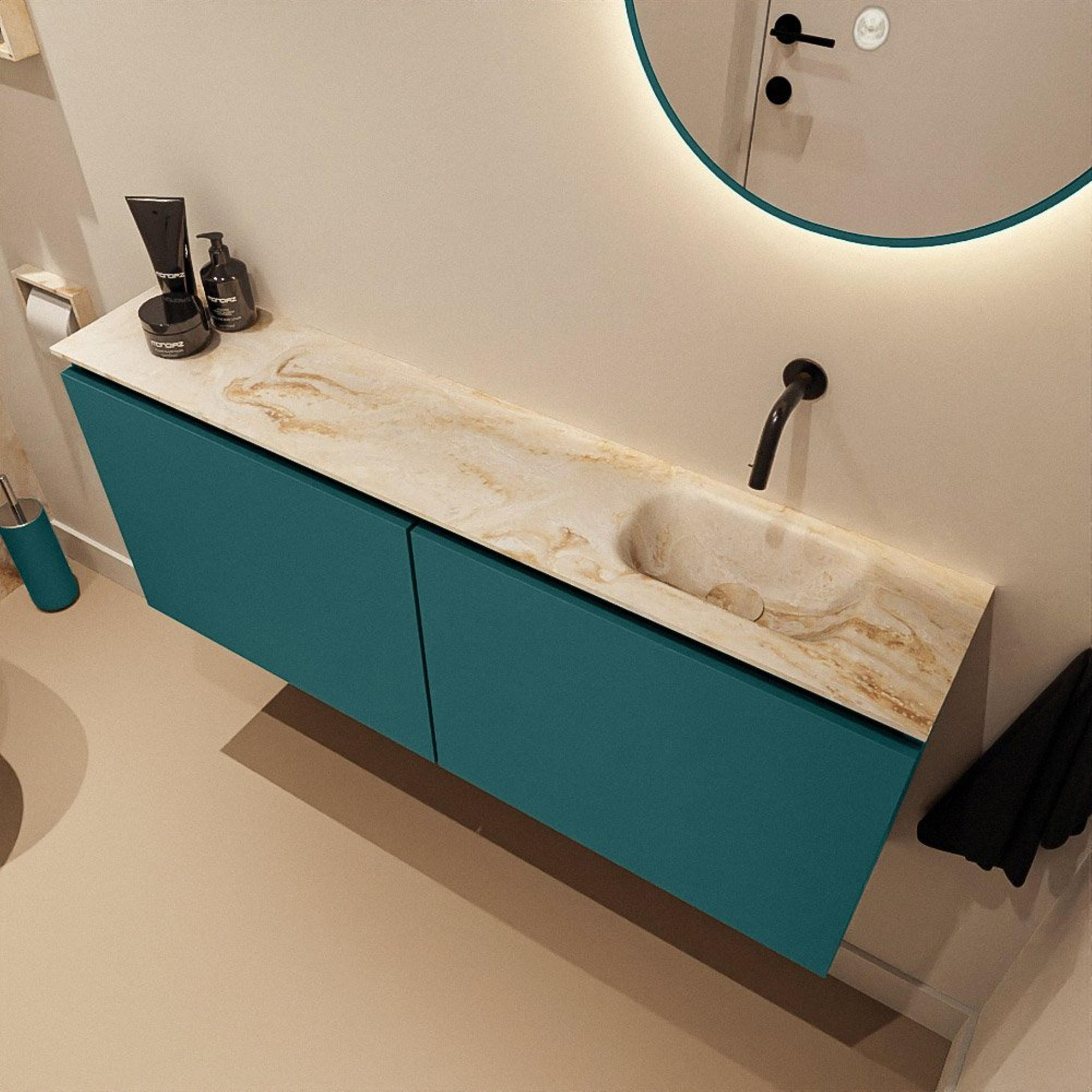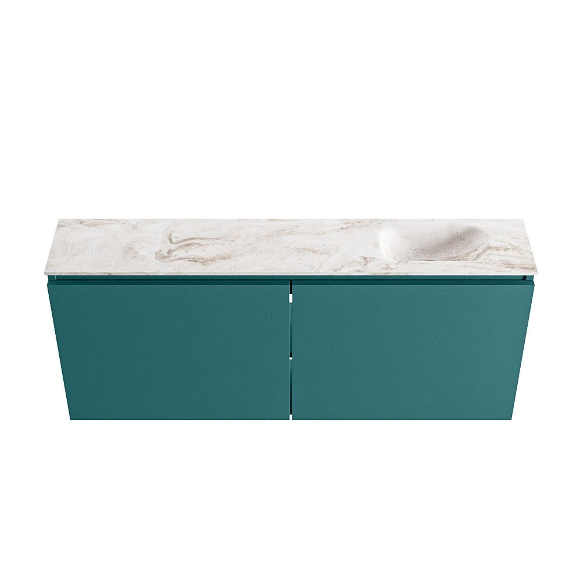 Avec ce meuble WC compact et élégant, vous créez en une seule fois une allure luxueuse dans vos toilettes, sans faire de concessions sur la fonctionnalité. Grâce à sa faible profondeur, c'est un choix idéal pour les toilettes petites ou allongées, tandis que la largeur généreuse de 120 cm crée justement un ensemble calme et chic. La combinaison du meuble vert et du plan vasque beige en solid surface offre un aspect à la fois moderne et chaleureux, ce qui lui permet de s'intégrer facilement dans un style contemporain, hôtel chic ou scandinave. La vasque à droite offre une disposition logique si vous arrivez par la droite en entrant par la porte, et comme il n'y a pas de trou de robinet, vous avez la liberté de choisir un beau robinet posé et une bonde encastrée assortie. Si vous recherchez un meuble WC peu profond, moderne, qui semble spacieux, hygiénique et prêt pour un usage quotidien intensif, c'est alors un choix très astucieux et durable.