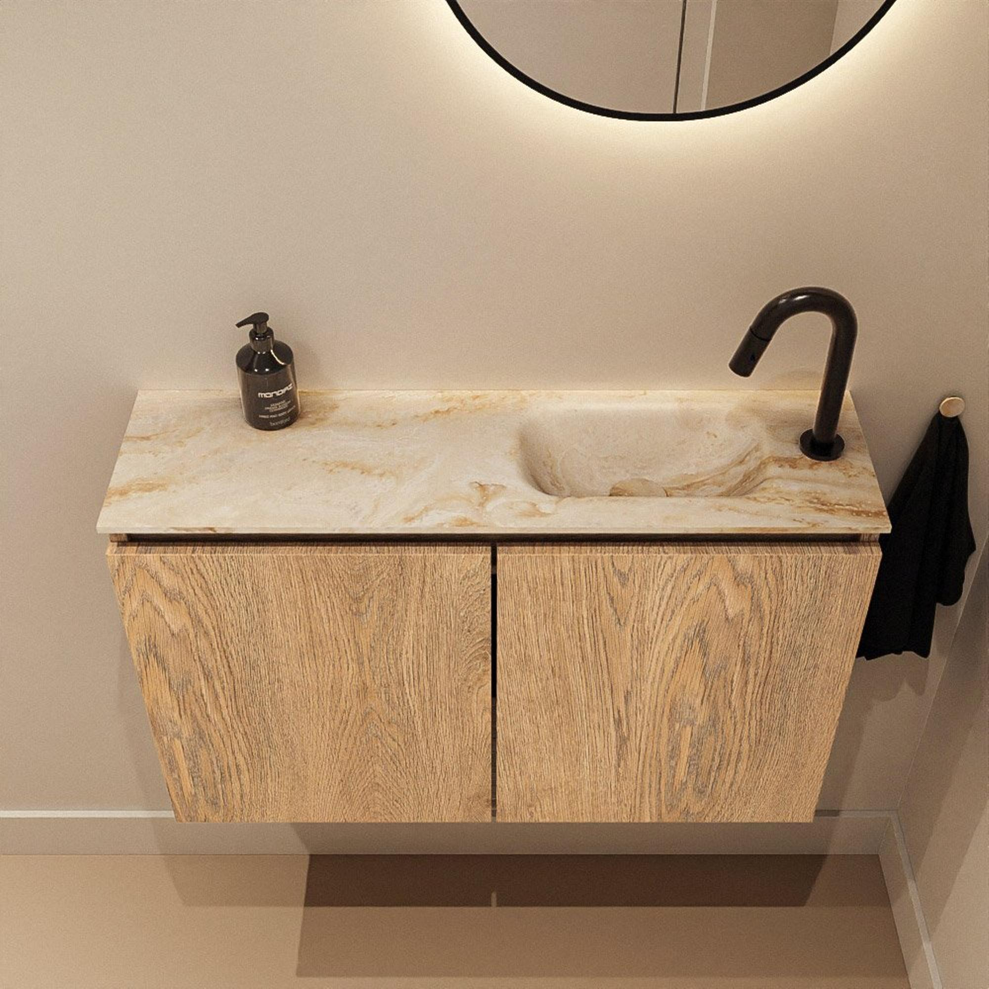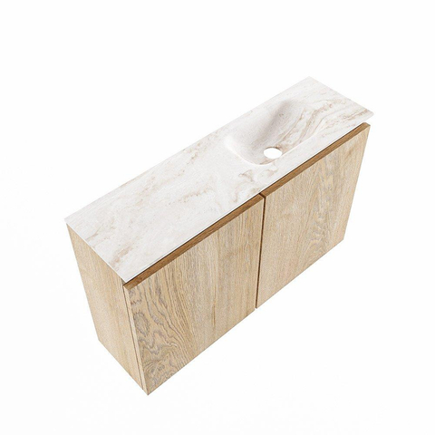 MONDIAZ TURE-DLUX Meuble pour toilettes 80 cm Washed Oak. Lavabo EDEN Frappe position droite. Avec 1 trou de robinet.