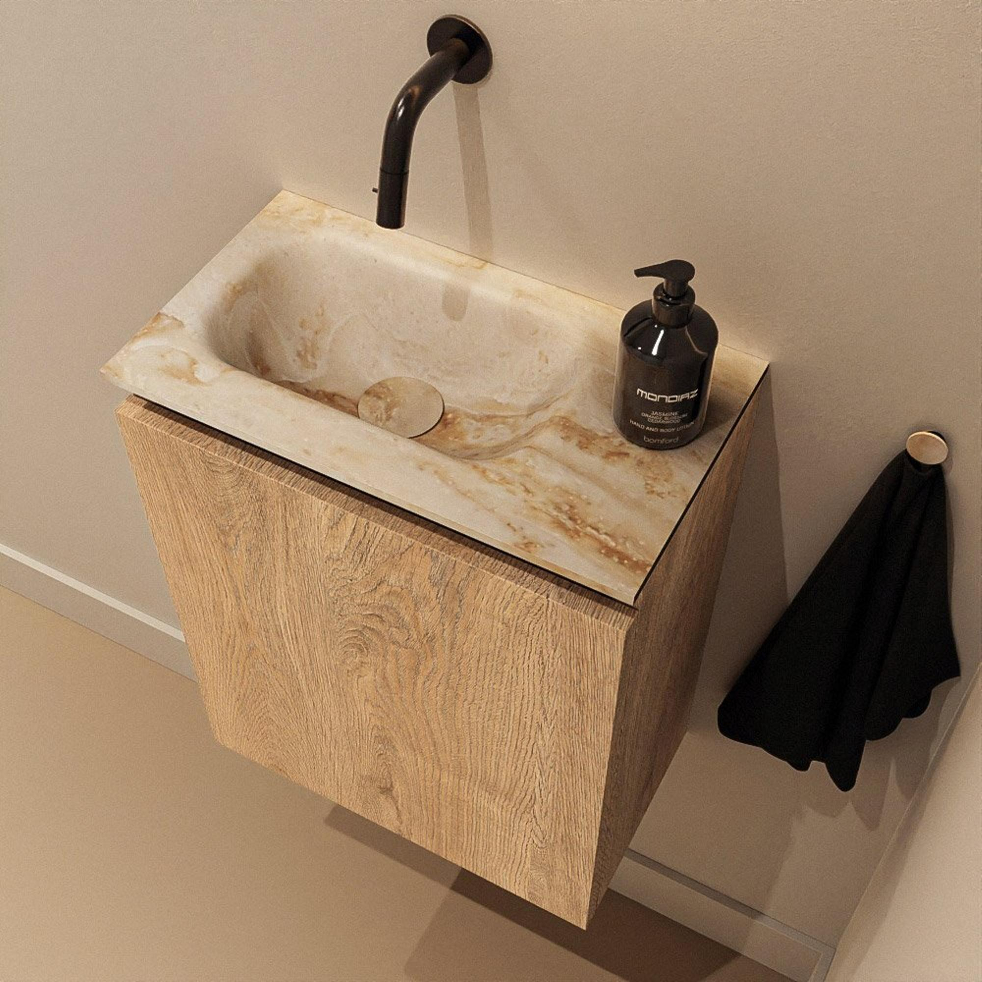 Si vous recherchez un meuble compact mais élégant pour vos toilettes ou une petite salle de bains, cette combinaison est un choix judicieux. Grâce à sa faible profondeur, il occupe à peine de place, tout en vous offrant un lavabo complet et un espace de rangement pratique. L'aspect chaleureux du bois crée immédiatement une ambiance accueillante, idéal si vous aimez un style moderne mais pas trop strict. Grâce au lavabo positionné à gauche, vous pouvez parfaitement adapter l'agencement à votre espace, par exemple à côté des toilettes ou en face de la porte. La combinaison avec un plan de lavabo solide dans une teinte beige douce rend l'ensemble calme et intemporel, ce qui le rend parfait aussi bien pour les nouveaux WC que pour les toilettes rénovées. Cela rend le meuble particulièrement adapté à ceux qui souhaitent combiner confort, design et facilité d'utilisation dans une configuration WC compacte.