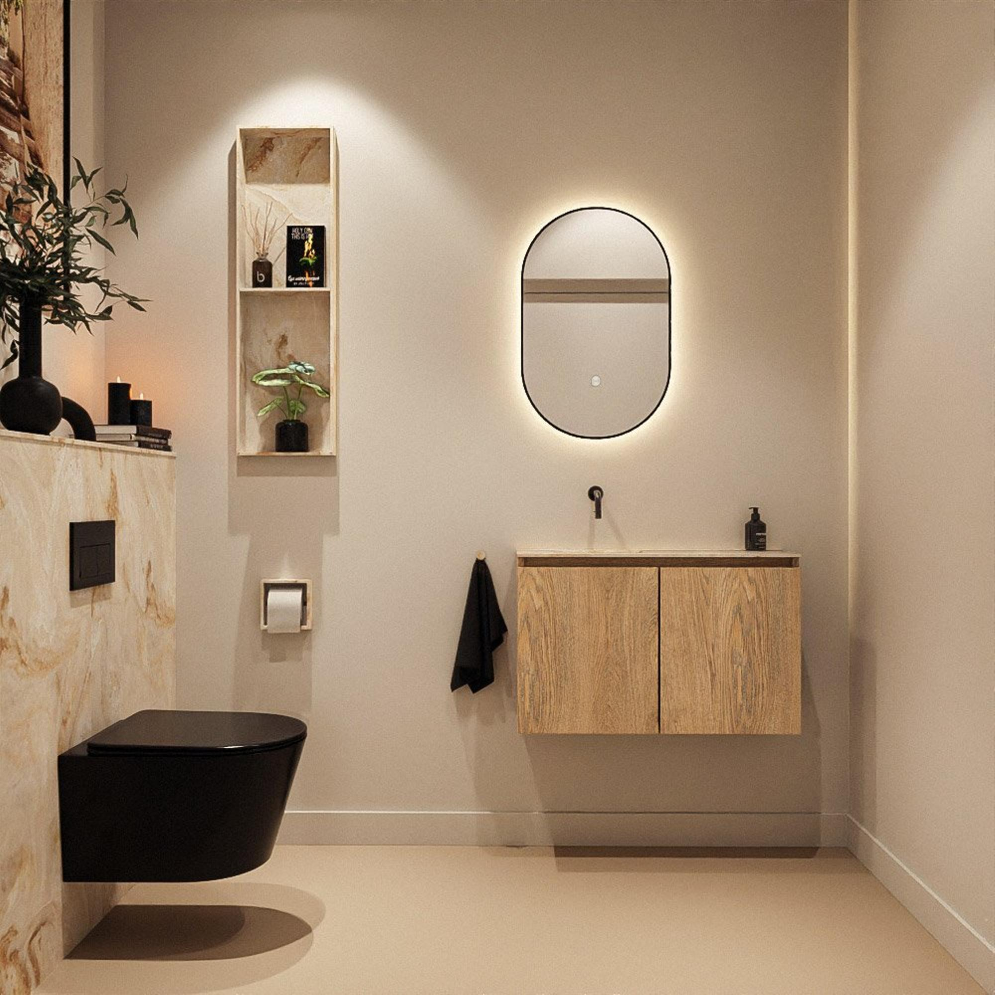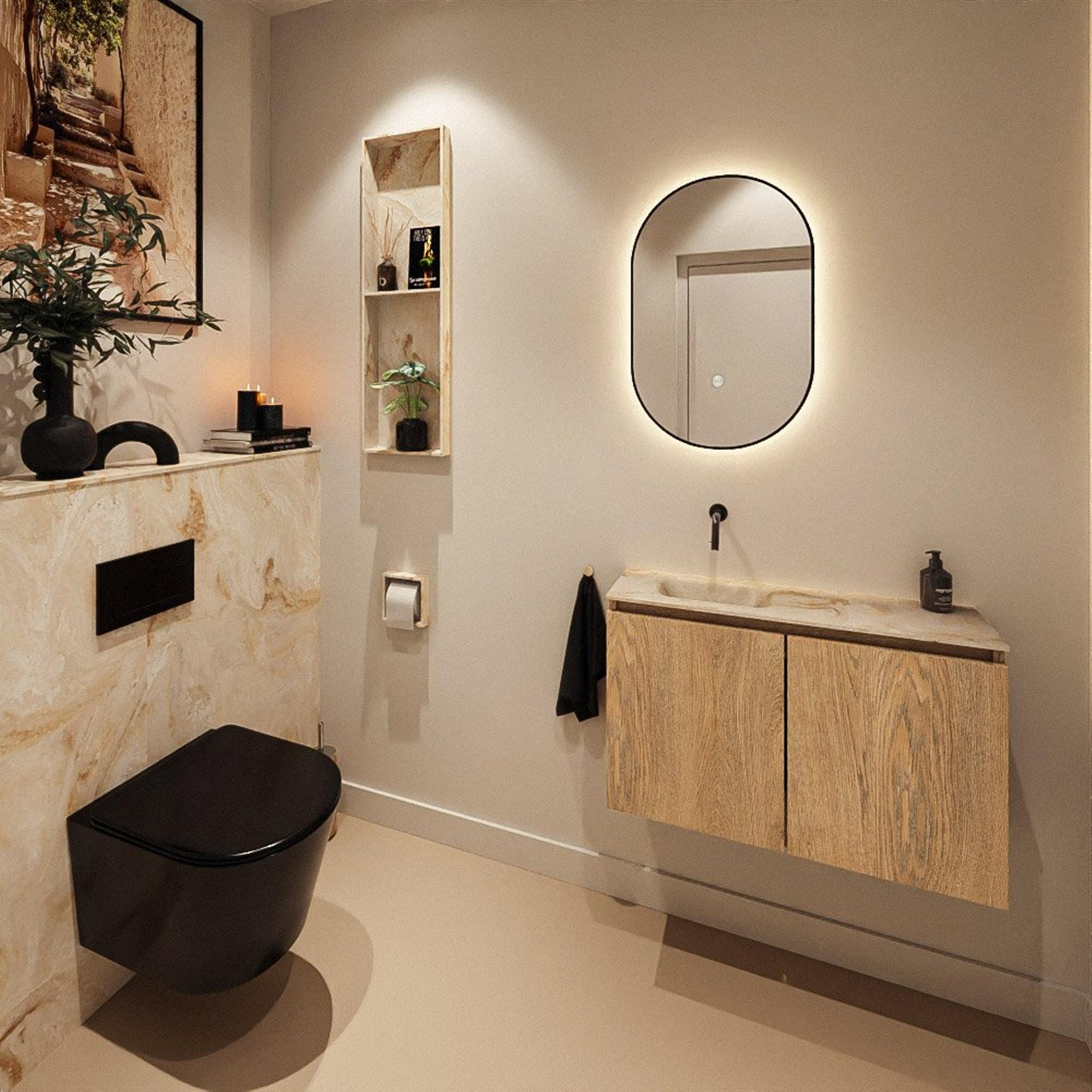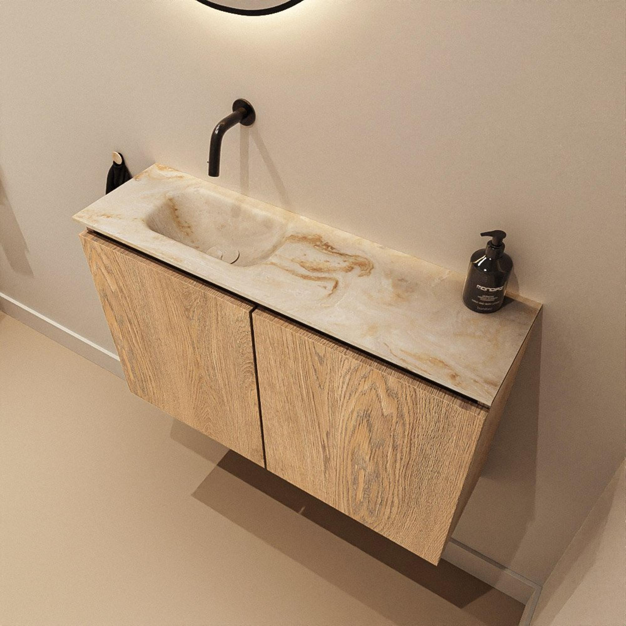 Ce meuble de toilettes compact et peu profond est idéal si vous souhaitez une solution de lavabo complète et moderne dans un petit espace WC ou une salle de bains étroite. Grâce à la combinaison d’un décor bois élégant et d’une vasque épurée dans une teinte beige chaude, la pièce paraît immédiatement confortable et soignée. La faible profondeur vous permet de vous déplacer facilement, même dans un passage étroit, tout en disposant d’assez de surface et d’espace de rangement pour les articles de toilette quotidiens. Grâce à la position du robinet à gauche et à la conception bien pensée, ce meuble est particulièrement adapté le long d’un mur latéral ou dans un espace allongé, où chaque centimètre compte. Si vous aimez un look moderne et apaisant avec un espace de rangement pratique derrière des portes plutôt que des niches ouvertes, cet ensemble répond parfaitement à vos attentes.