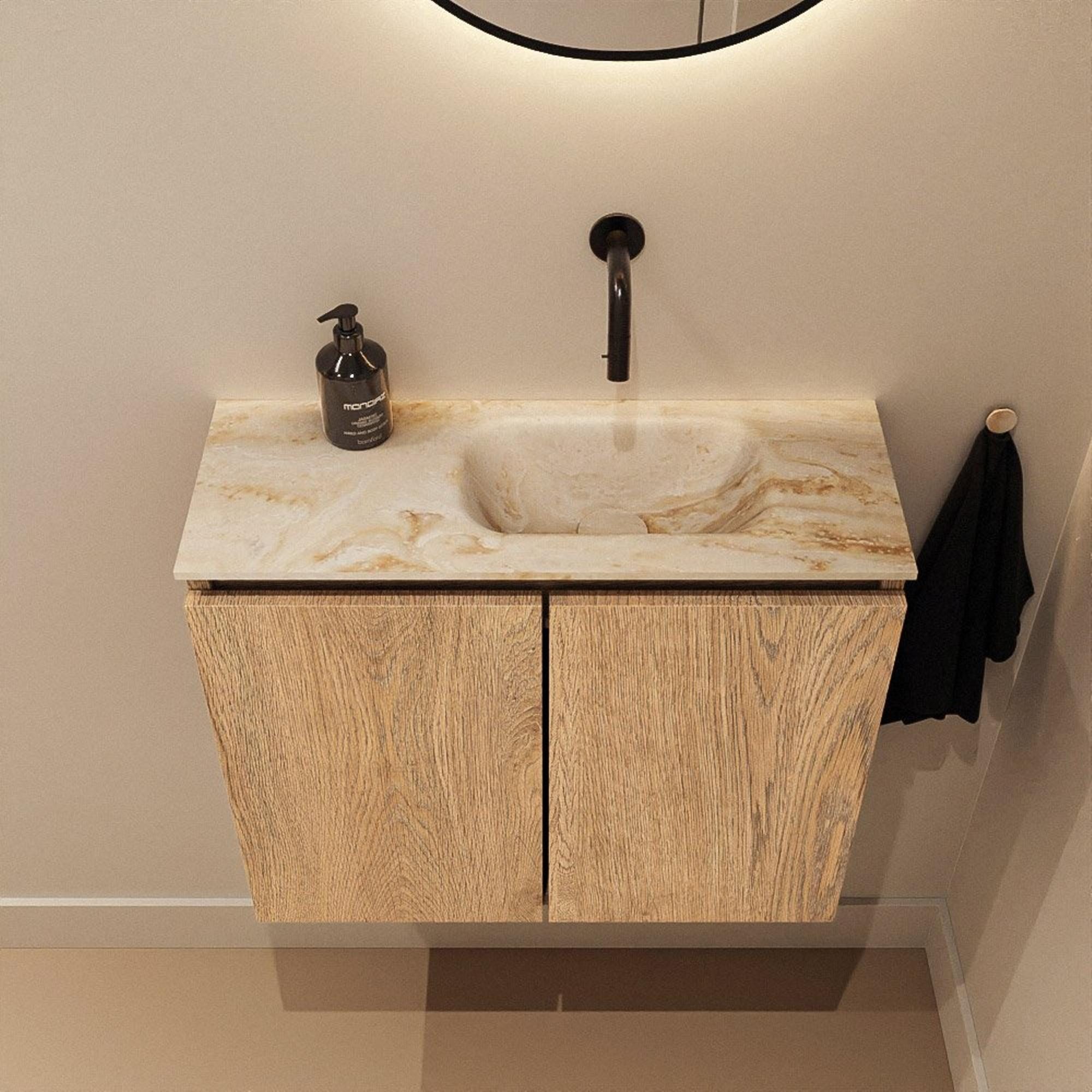 MONDIAZ TURE-DLUX Meuble WC 60cm Washed Oak. EDEN vasque Frappe position droite. Sans trou de robinet.