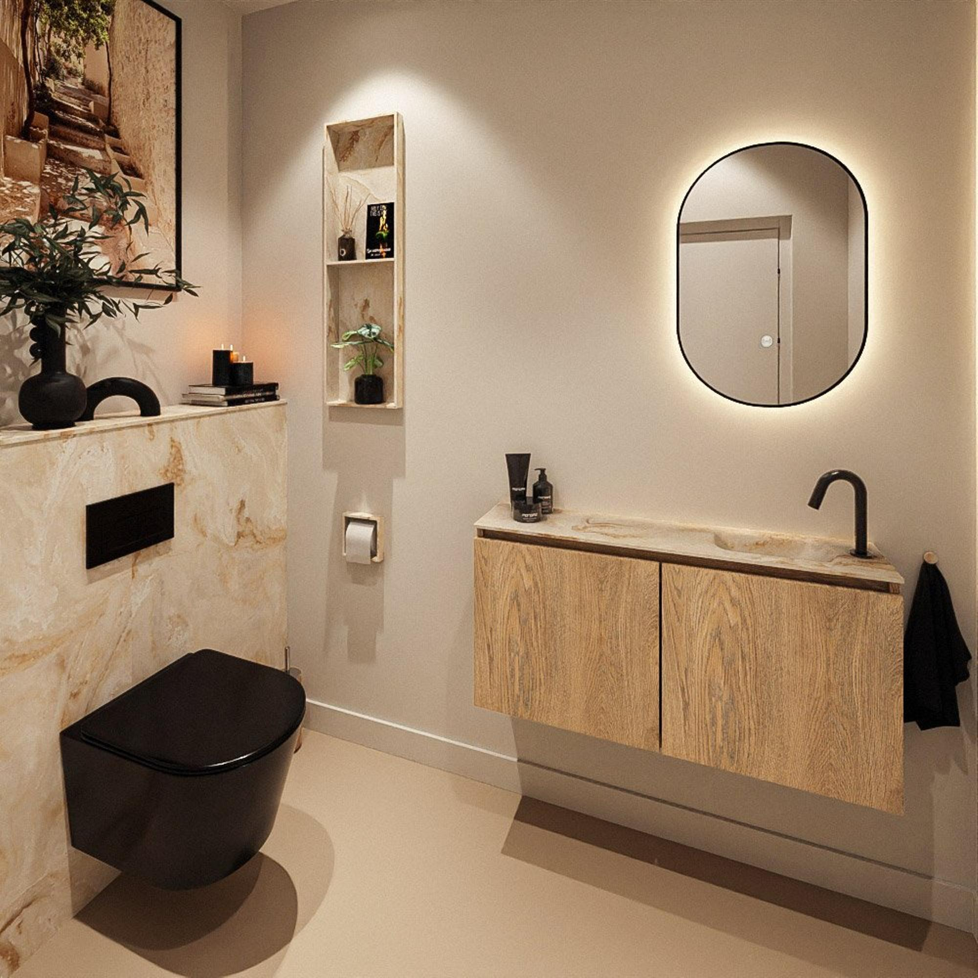 La couleur Washed Oak offre une apparence naturelle et accueillante et apporte instantanément de la chaleur à votre espace toilettes. La finition en mélamine est ici un choix judicieux : vous profitez du look du vrai bois, mais avec les avantages pratiques d’un matériau facile d’entretien. Le plan beige en solid surface avec lavabo Eden intégré forme un contraste élégant avec le bois et paraît sobre et luxueux. Cette combinaison s’accorde parfaitement avec un style moderne, minimaliste ou hôtel chic et se marie facilement avec des carreaux clairs, un effet béton ou d’autres nuances de bois.
