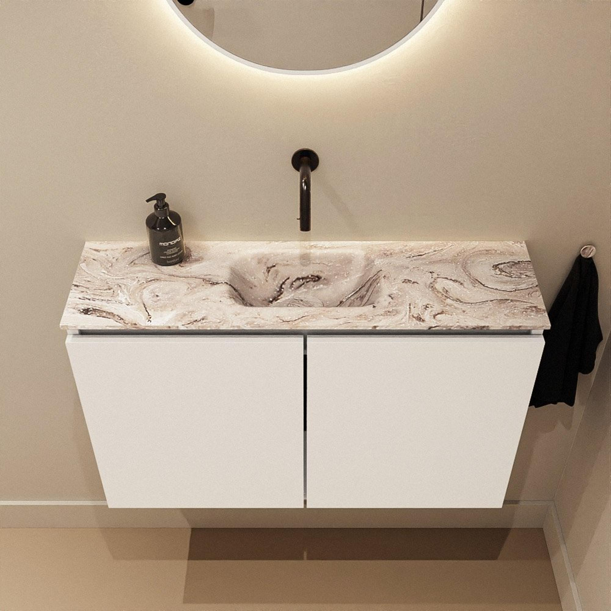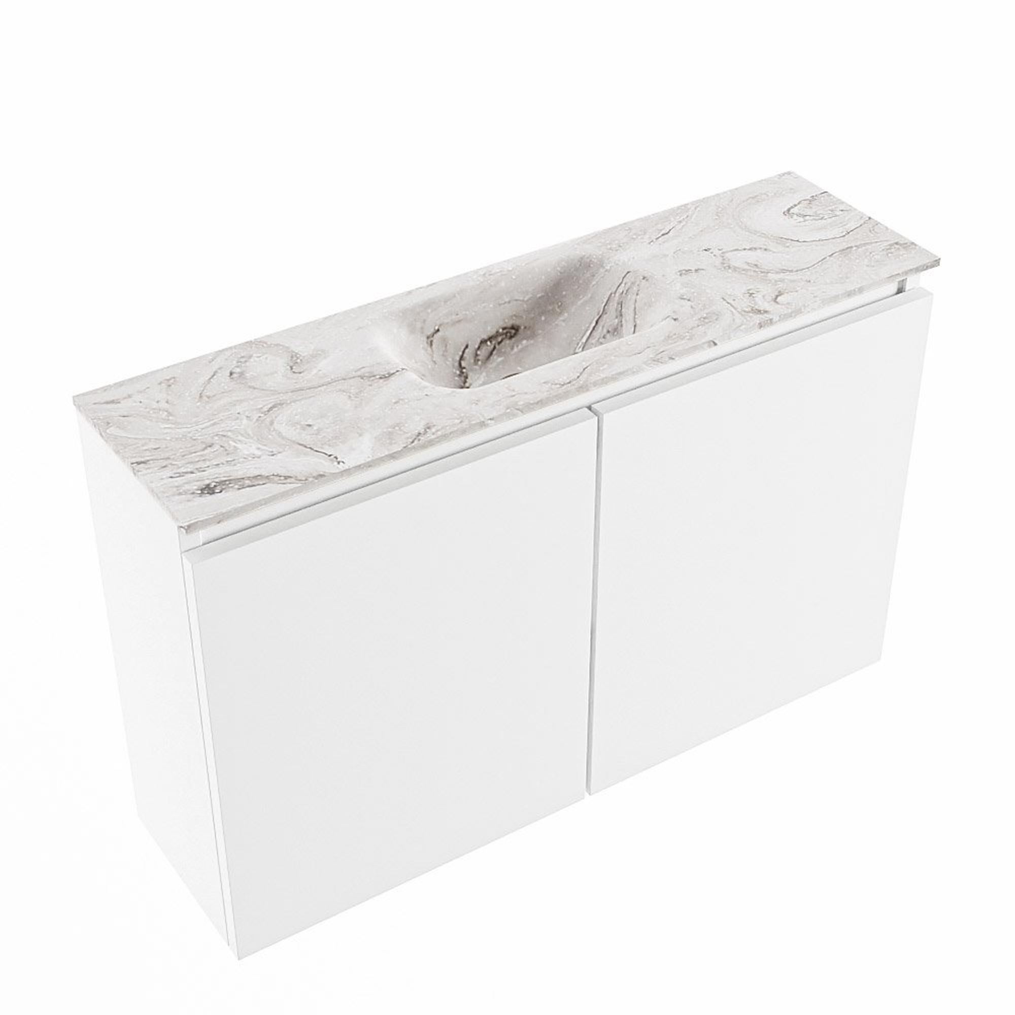 Avec une largeur de 80 cm et une profondeur de seulement 23 cm, ce meuble est idéal pour les WC, les petites salles de bains ou une niche étroite. La vasque centrale assure une position d'utilisation agréable, sans devoir vous tenir trop en avant. Grâce à sa faible profondeur, vous conservez suffisamment d'espace de circulation, ce qui donne immédiatement à la pièce une impression de grandeur et d'ordre. Les deux portes sans poignées offrent suffisamment d'espace de rangement pour les articles de toilette du quotidien, afin que vous puissiez garder le dessus de meuble dégagé et ordonné. Vous créez ainsi un ensemble épuré et fonctionnel, même si votre salle de bains ou votre WC n'est pas grand. Cela rend ce meuble particulièrement adapté à ceux qui recherchent un effet maximal dans un espace minimal.