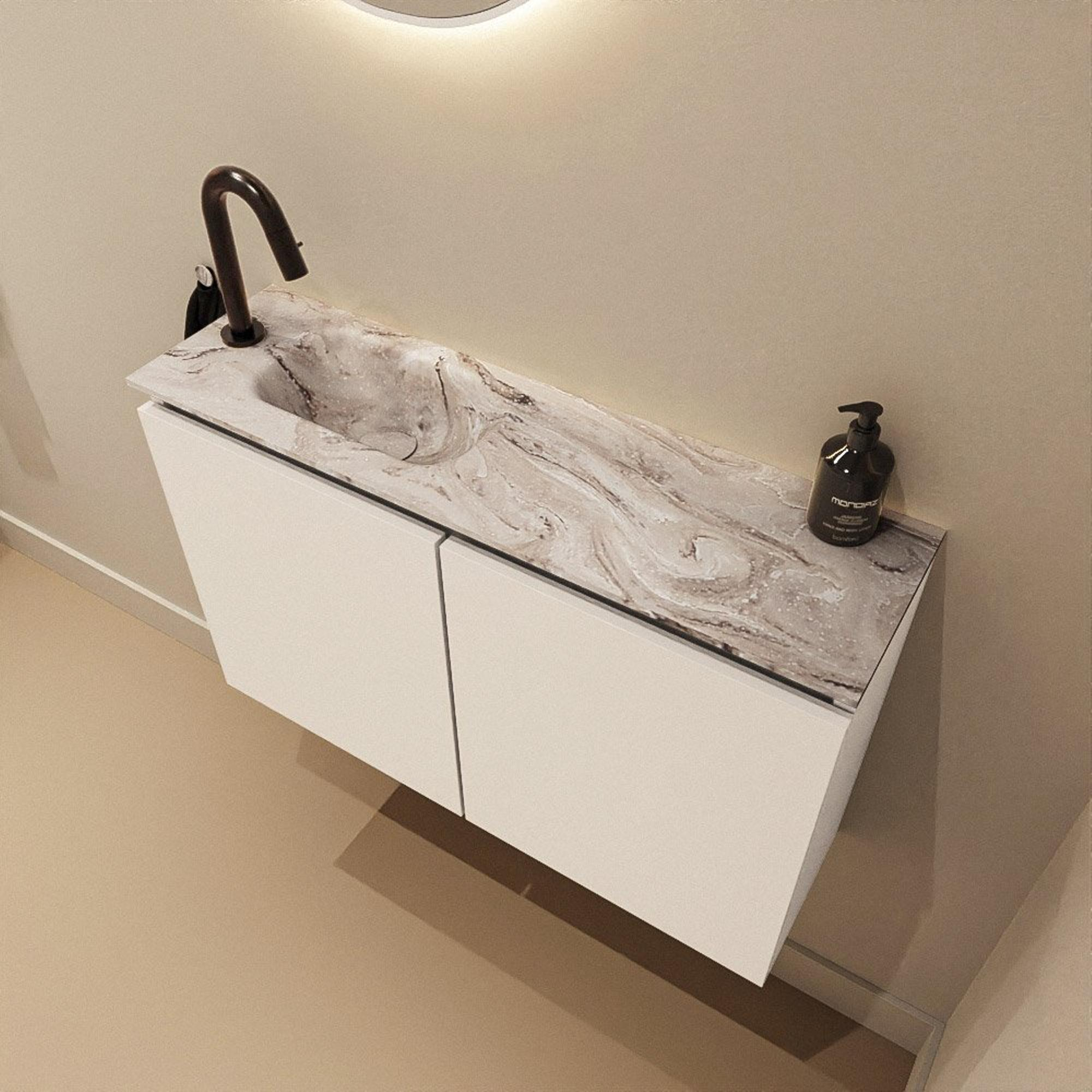 La combinaison du meuble couleur talc et du plan et lavabo effet marbre offre un aspect contemporain et luxueux qui s’intègre parfaitement dans une salle de bains ou des toilettes modernes. La teinte douce et neutre du meuble se marie facilement avec des carreaux effet béton, des structures bois ou au contraire des murs blancs épurés. Les façades sans poignées créent un look minimaliste sans interruptions, donnant à l’ensemble une allure calme et chic. Le lavabo Glace de la série Eden s’y associe parfaitement : lignes épurées, discret et moderne. Vous créez ainsi, avec un meuble relativement compact, un véritable effet design dans vos toilettes, sans que celui-ci ne domine l’espace.