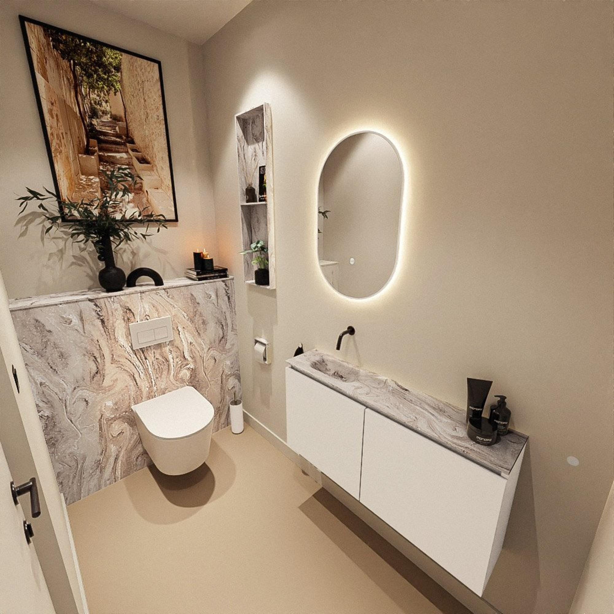 Le meuble bas de couleur Talc forme un accent de base doux et clair qui se marie aisément avec des WC blancs, des carreaux aspect pierre naturelle ou des essences de bois chaudes. Le lavabo Eden en finition Glace avec plan vasque aspect marbre y ajoute une atmosphère luxueuse, presque digne d'un hôtel. La finition moderne sans poignées met en valeur les lignes épurées et permet à l'ensemble de rester sobre visuellement, même dans un petit espace. Grâce au choix d'un lavabo sans trou de robinet, vous pouvez jouer avec de beaux mitigeurs encastrés au mur ou un robinet surélevé élancé à côté de la cuve. L'ensemble s'adapte ainsi parfaitement à votre goût personnel et au reste de votre salle de bains.
