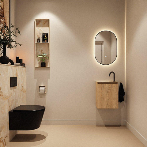 Avec des dimensions de 40x23x50 cm, ce meuble est spécialement conçu pour les petits WC et les salles de bains compactes. Sa faible profondeur vous permet de circuler facilement le long du meuble sans qu'il ne gêne, même dans un couloir ou une niche étroits. Le lavabo est intelligemment agencé avec la cuve et le trou de robinet à gauche, afin que vous utilisiez au mieux l'espace disponible dans une configuration standard. Grâce au montage mural, le meuble semble littéralement flotter, ce qui agrandit visuellement l'espace. Vous profitez ainsi de tous les avantages pratiques d'un meuble lave-mains, sans sacrifier l'espace de circulation ni le confort.