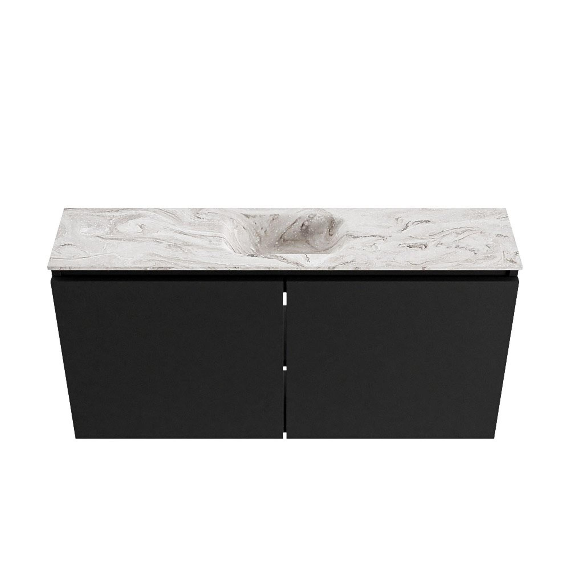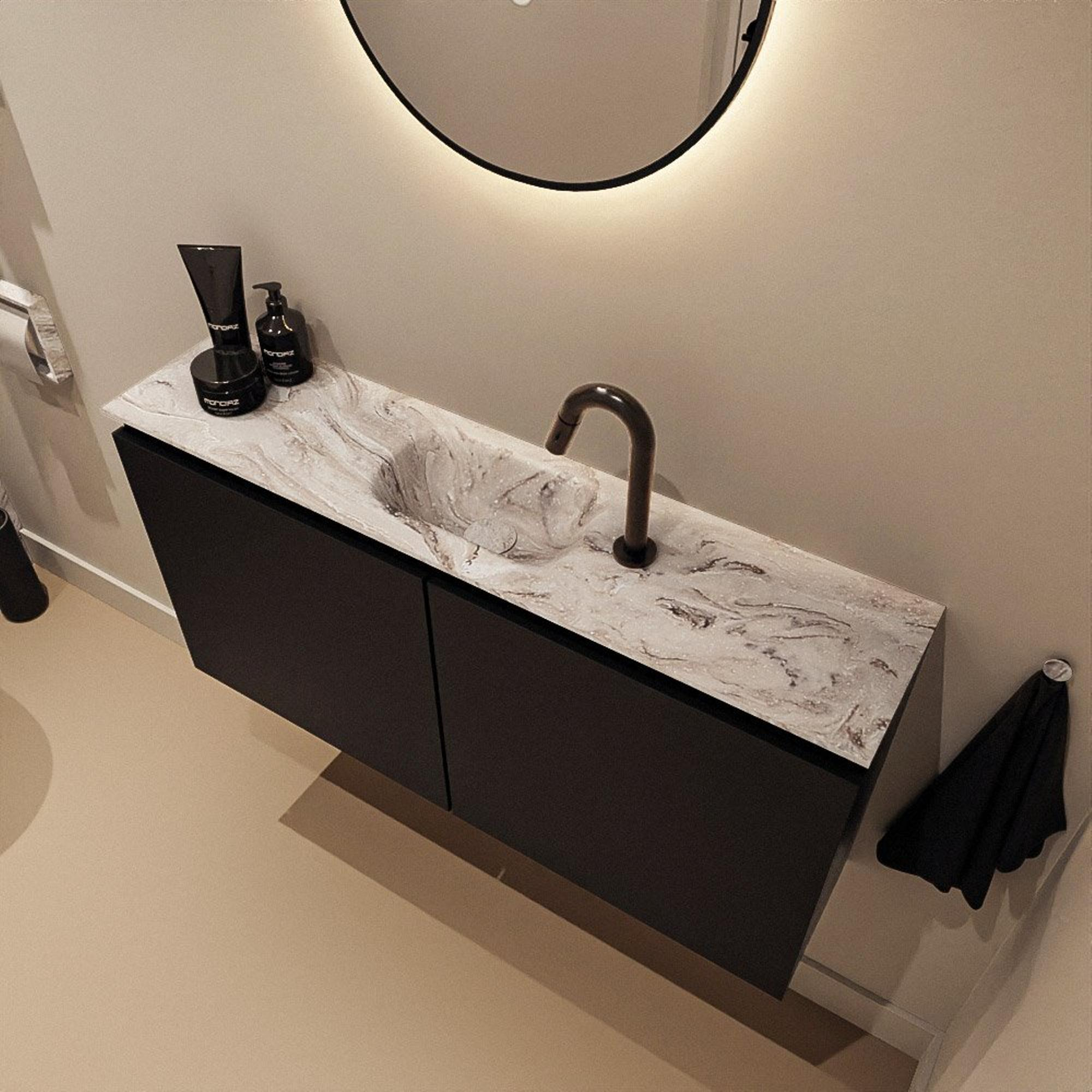 La combinaison de la couleur Urban du meuble et du plateau couleur marbre offre une apparence contemporaine et luxueuse. Les façades sans poignées créent un look minimaliste et apaisant qui s’accorde parfaitement aux intérieurs modernes et industriels. Avec sa largeur de 100 cm, le meuble crée une ligne horizontale qui élargit visuellement l’espace, idéal si vos toilettes ou votre petite salle de bains sont étroites. La vasque positionnée au centre assure une belle symétrie et laisse de chaque côté suffisamment d’espace de dépose pour le savon, des bâtonnets parfumés ou un accessoire décoratif. Vous transformez ainsi un espace souvent oublié en un ensemble élégant qui s’intègre parfaitement au reste de votre habitation.