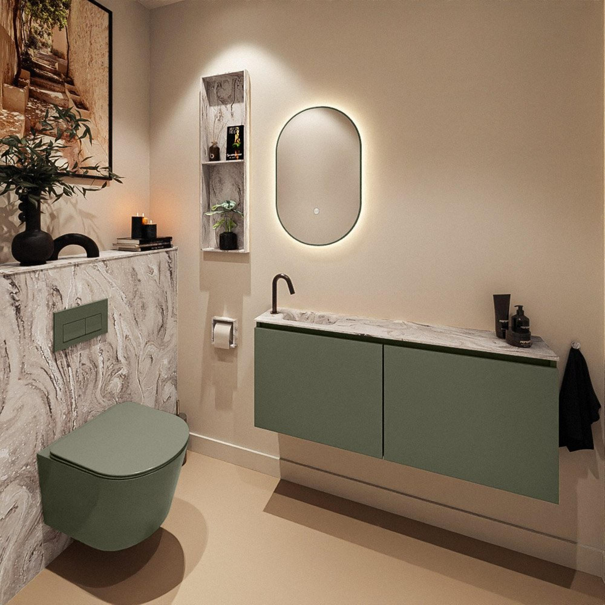 Vous cherchez un meuble WC compact mais luxueux qui prend peu de profondeur tout en offrant beaucoup de style ? Alors ce meuble est un choix judicieux. Avec sa faible profondeur, il est idéal pour les toilettes ou une petite salle de bains où vous souhaitez utiliser chaque centimètre de manière efficace, sans sacrifier le confort ni l’espace de rangement. La combinaison d’un meuble bas épuré dans une teinte vert gris robuste et d’un lavabo élégant à l’aspect marbre crée une ambiance moderne digne d’un hôtel. Grâce au trou de robinet à gauche, cette configuration est particulièrement pratique lorsque l’espace mural est limité d’un côté ou lorsque vous souhaitez optimiser l’espace de circulation. Ce meuble s’intègre parfaitement dans un style moderne ou industriel, mais se marie aussi très bien avec des matériaux naturels et apaisants tels que le bois et des carreaux doux. Si vous optez pour un espace à la fois pratique et élégant, ce meuble WC constitue une base solide.