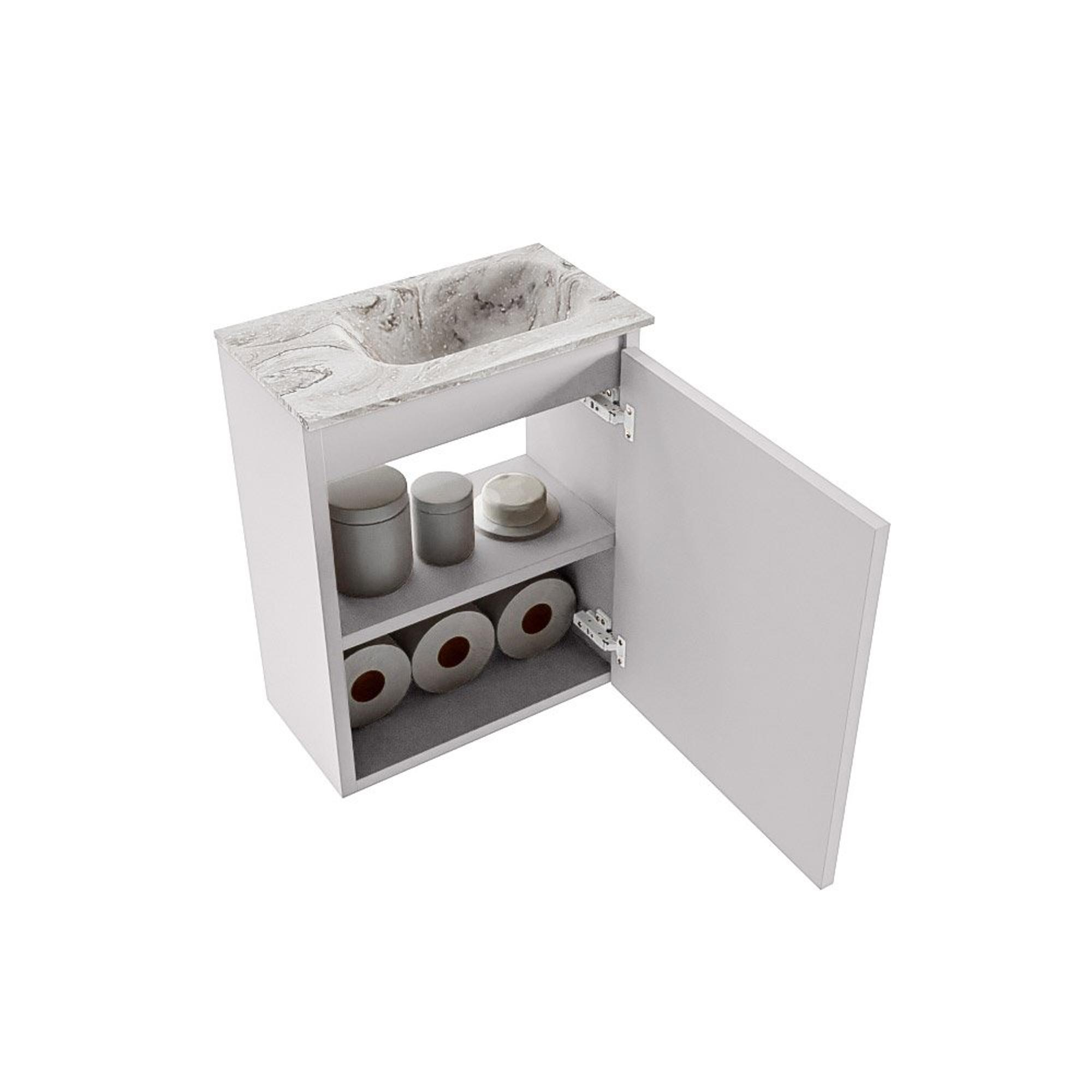 Vous recherchez un meuble de toilettes compact mais luxueux qui s’intègre parfaitement dans un espace WC moderne ou une petite salle de bains, sans rien sacrifier au style ni au confort d’utilisation ? Alors ce meuble épuré avec lavabo intégré est un choix judicieux. Grâce à sa faible profondeur, il est idéal pour les espaces étroits ou une niche, tandis que la combinaison d’un lavabo effet marbre chaleureux et d’un meuble gris moderne offre immédiatement une apparence haut de gamme. La position du trou de robinet à droite le rend pratique si, par exemple, vous avez une porte qui s’ouvre vers la gauche ou si l’agencement des murs l’exige. Ce meuble s’accorde parfaitement avec un style moderne, minimaliste ou hôtel chic et convient particulièrement si vous souhaitez un aspect calme et ordonné, tout en attachant de l’importance à la qualité et au confort quotidien.