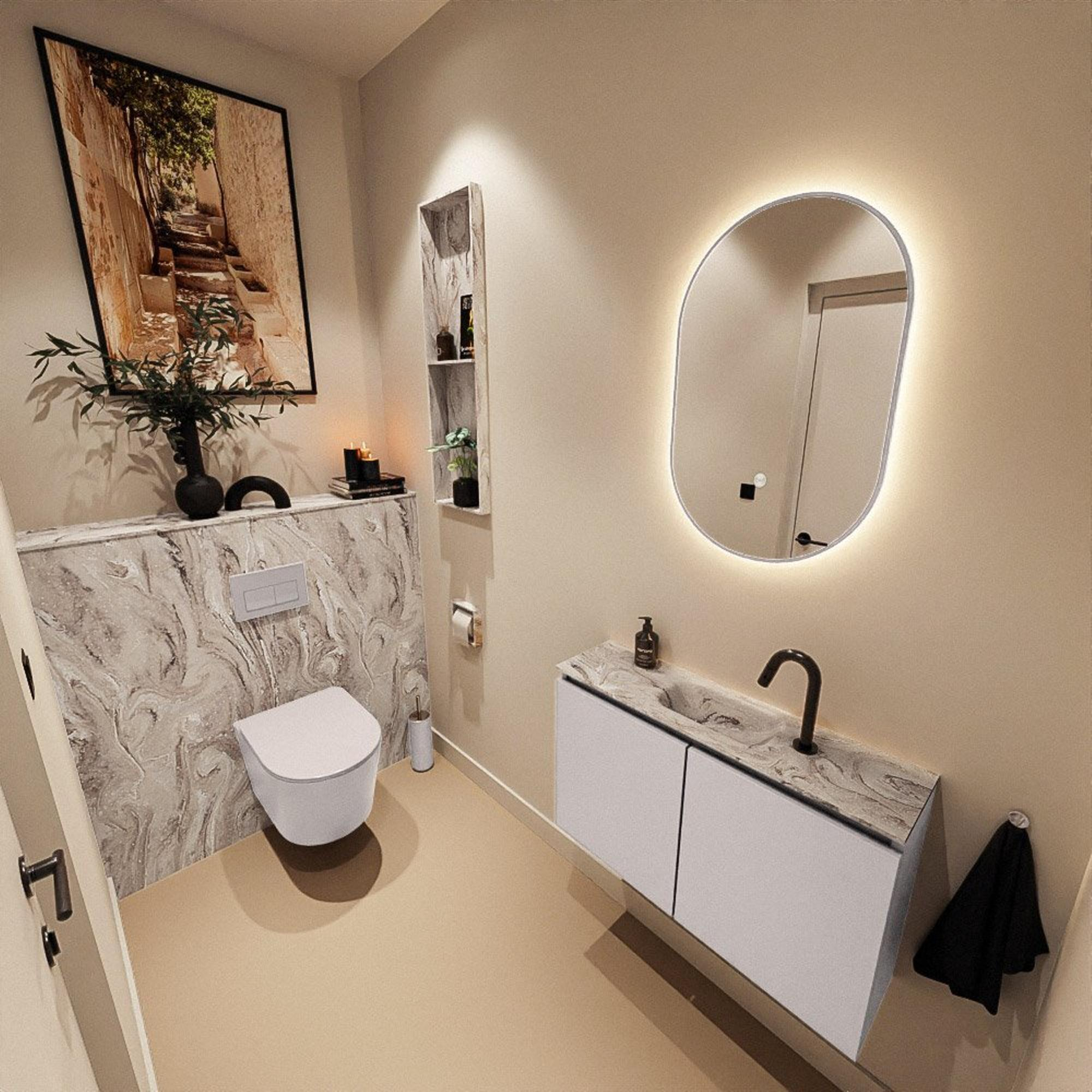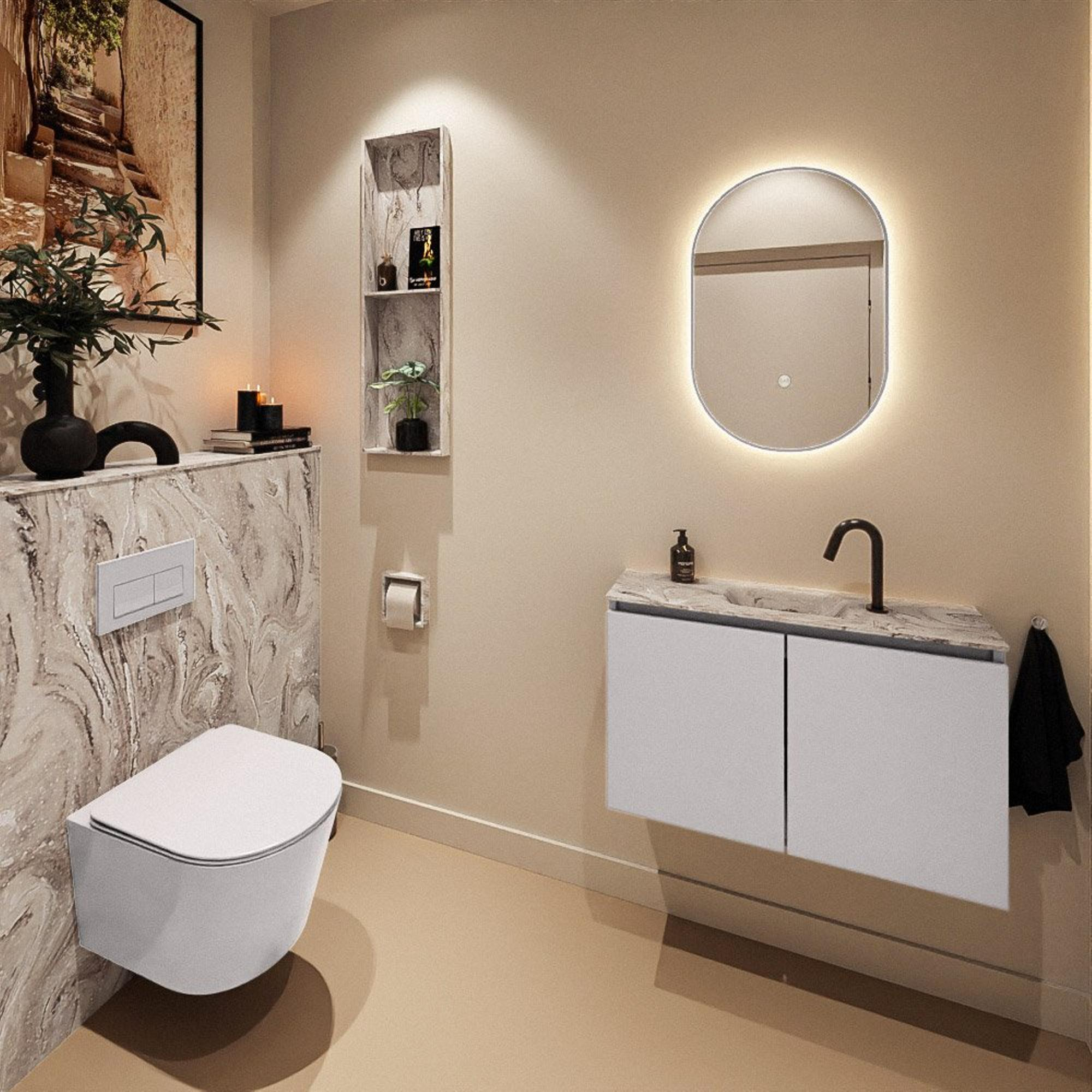 Avec une largeur de 80 cm et une profondeur de seulement 23 cm, vous exploitez de manière optimale l'espace disponible, sans que la zone de passage ne devienne trop étroite. C'est exactement ce dont vous avez besoin dans un WC compact : suffisamment de surface et d'espace de lavage, mais pas de meuble encombrant qui bloque le passage. La vasque est placée au centre, ce qui vous permet de vous laver les mains confortablement même dans les espaces plus étroits. Grâce aux deux portes, vous disposez en outre d'un espace de rangement suffisant pour les rouleaux de papier toilette, les produits d'entretien ou les serviettes invité, afin que vos toilettes aient toujours un aspect propre et ordonné. Le design fin, suspendu au mur, crée un effet d'espace et facilite grandement le nettoyage du sol.