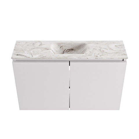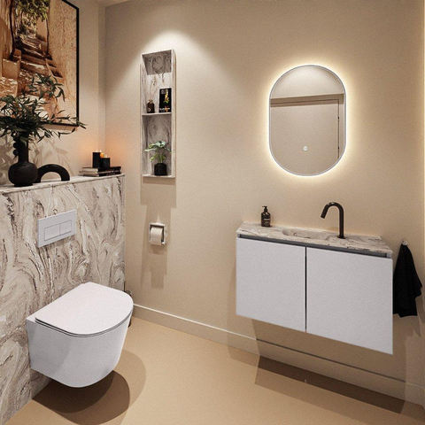 Le meuble est fabriqué en MDF, un matériau qui se prête parfaitement aux meubles de salle de bains modernes et épurés et qui est connu pour sa stabilité dimensionnelle et sa belle finition uniforme. La vasque est réalisée en solid surface aspect marbre, un matériau composite de haute qualité qui est chaud et doux au toucher tout en étant solide et durable. En cas de petits dommages, ce matériau peut souvent être légèrement réparé et conserve, en cas d'utilisation normale, son bel aspect pendant de nombreuses années. La combinaison du meuble gris (Cale) avec la couleur marbrée élégante du plan crée une allure luxueuse et design qui se marie facilement avec des robinetteries et accessoires noirs, chromés ou en métal brossé.