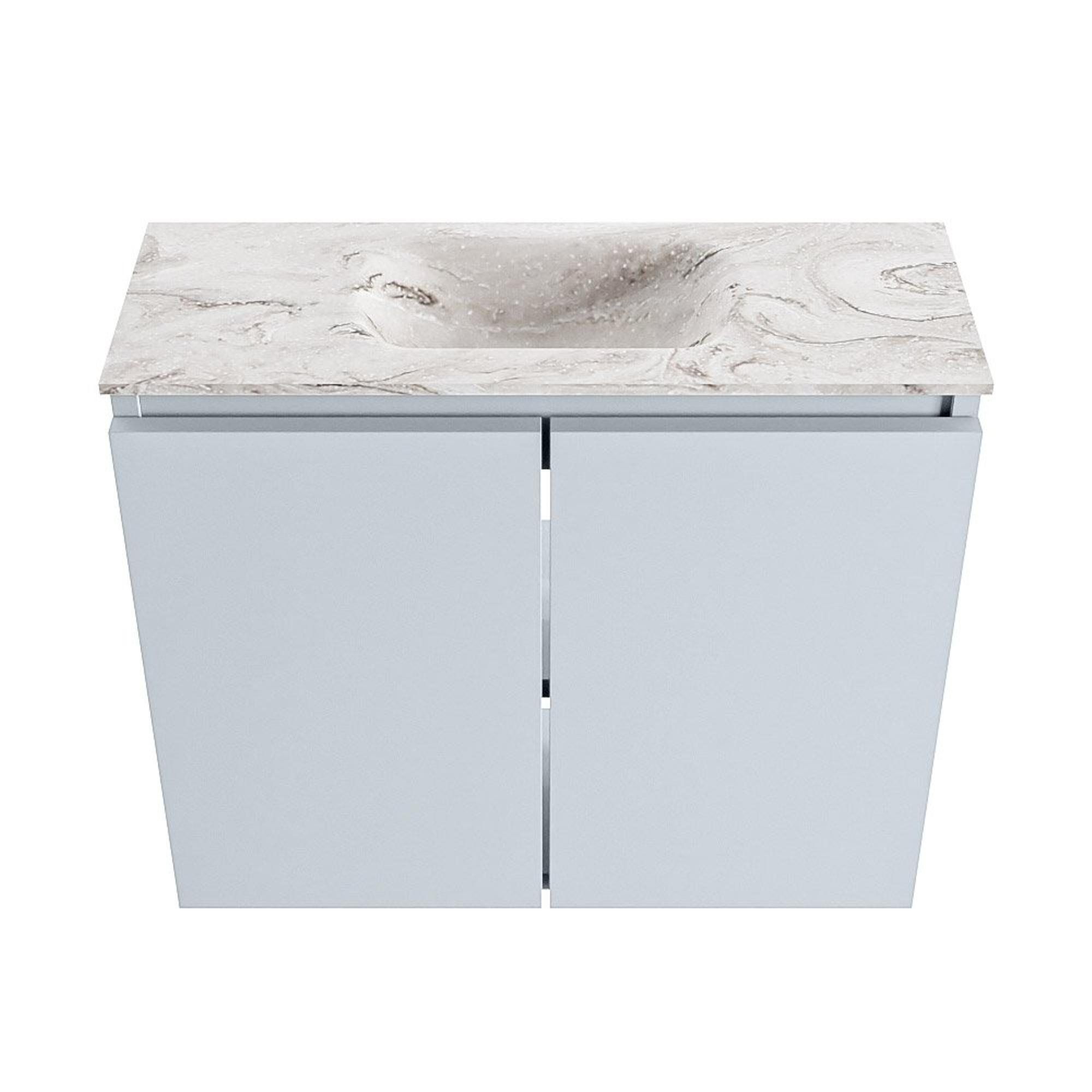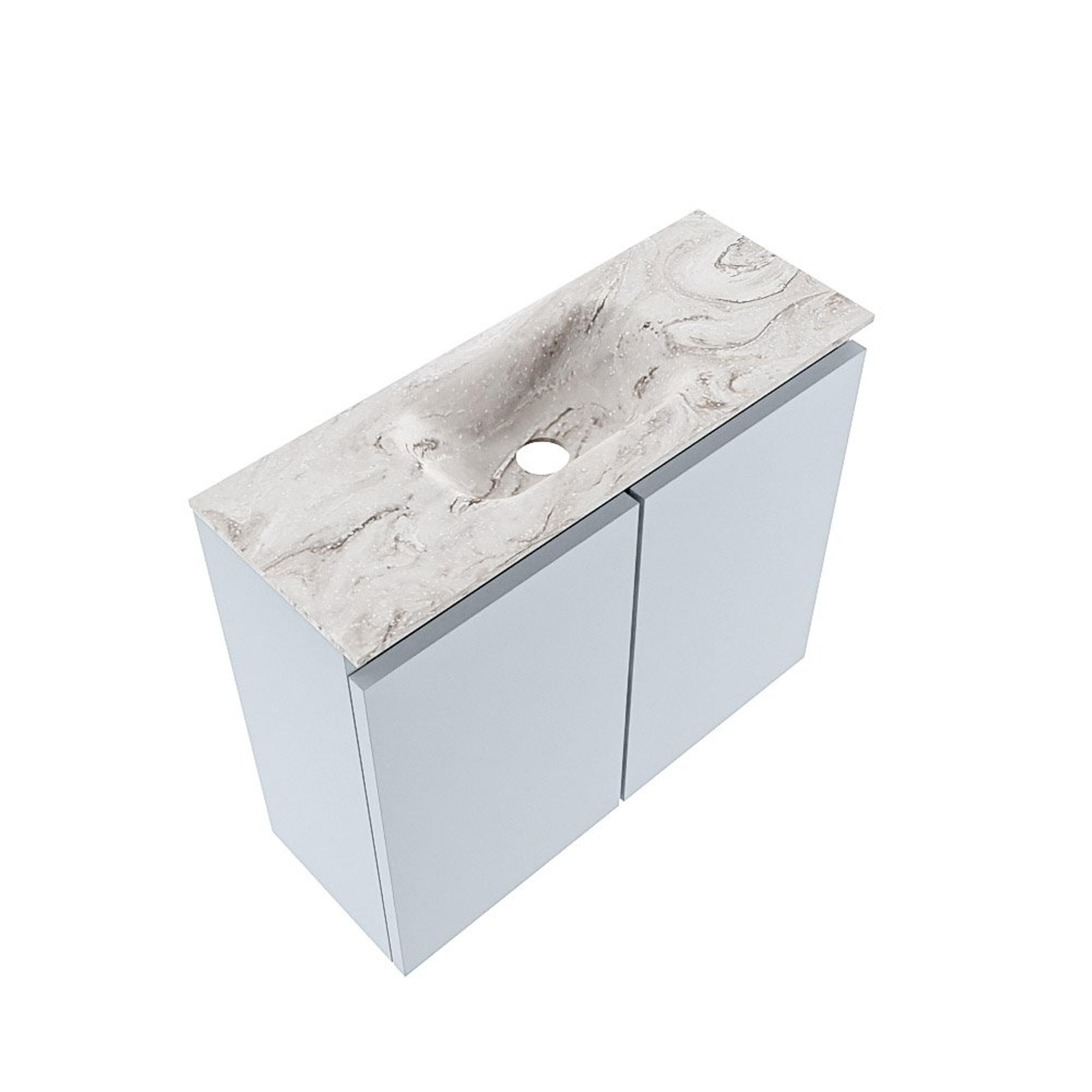 La couleur Clay du meuble offre une base chaleureuse et moderne qui se marie bien avec de nombreux types de carrelages et de matériaux naturels. Le plan aspect marbre renforce cette sensation de luxe : vous apportez chez vous l’ambiance d’un hôtel design, mais dans un meuble pratique, utilisable au quotidien. Grâce à la façade moderne sans poignées, l’ensemble reste épuré et minimaliste, sans détails chargés. Cette combinaison de teinte grise, de marbre et de lignes droites s’intègre parfaitement dans une salle de bains moderne ou de style scandinave, mais peut aussi constituer un contrepoint apaisant dans un intérieur plus ludique. Vous pouvez ainsi donner à vos toilettes une apparence marquée mais intemporelle.
