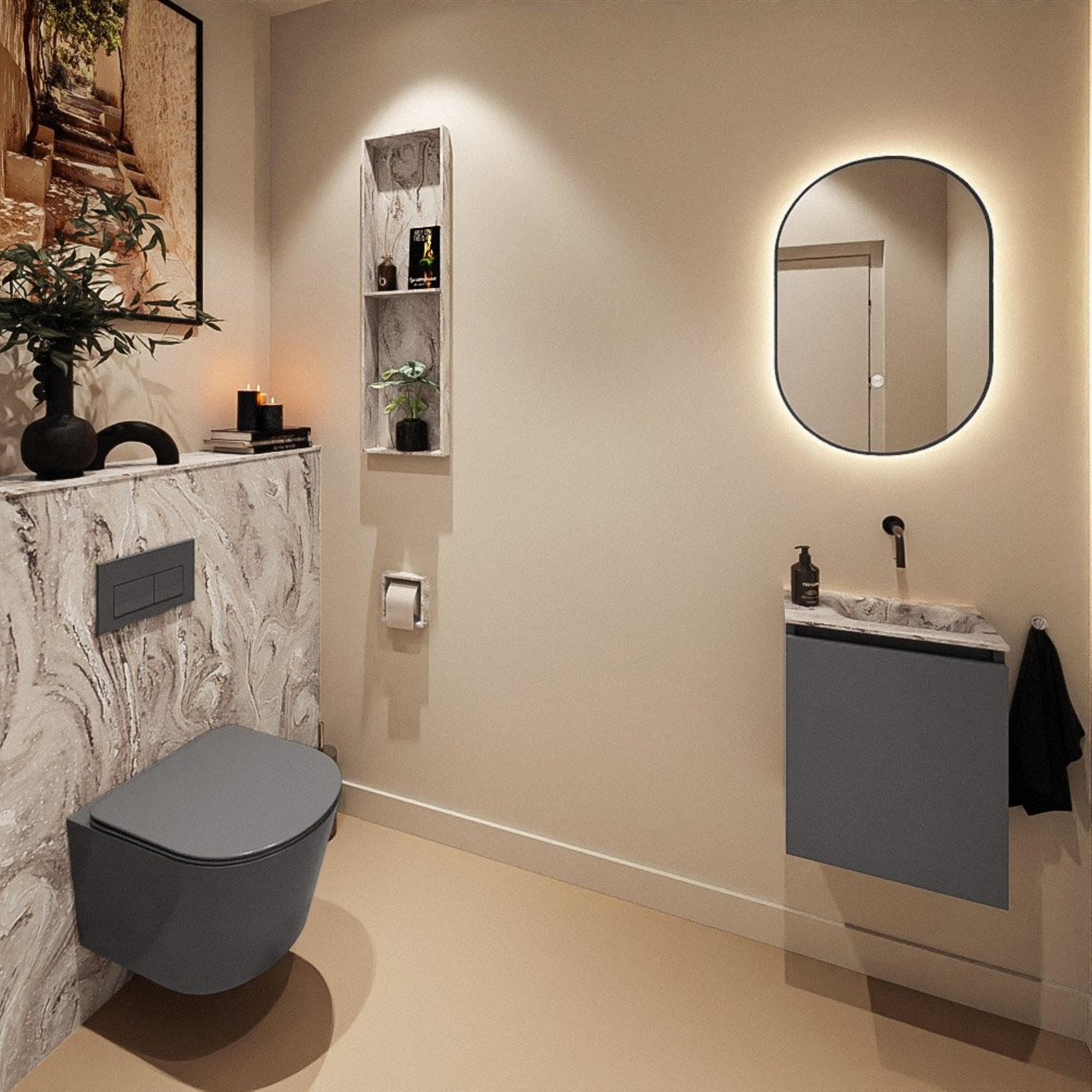 Avec ce meuble WC compact, vous créez en une seule fois une solution à la fois élégante et pratique pour votre espace toilettes ou votre petite salle de bains. Grâce à sa conception peu profonde, il s’intègre facilement dans les espaces étroits, par exemple dans un WC exigu ou le long d’un mur court, sans que vous ne perdiez d’espace de circulation précieux. La combinaison d’un meuble sombre et épuré avec un plan de toilette et un lavabo aspect marbre apporte immédiatement un look moderne, tandis que l’espace de rangement derrière la porte garde les accessoires de toilette qui traînent habituellement bien hors de vue. Comme le robinet est placé à droite du lavabo et que la vasque ne possède pas de trou de robinet, l’ensemble paraît particulièrement calme et minimaliste. Cela rend le meuble particulièrement adapté si vous aimez un style moderne et ordonné sans pour autant vouloir sacrifier le confort d’utilisation.