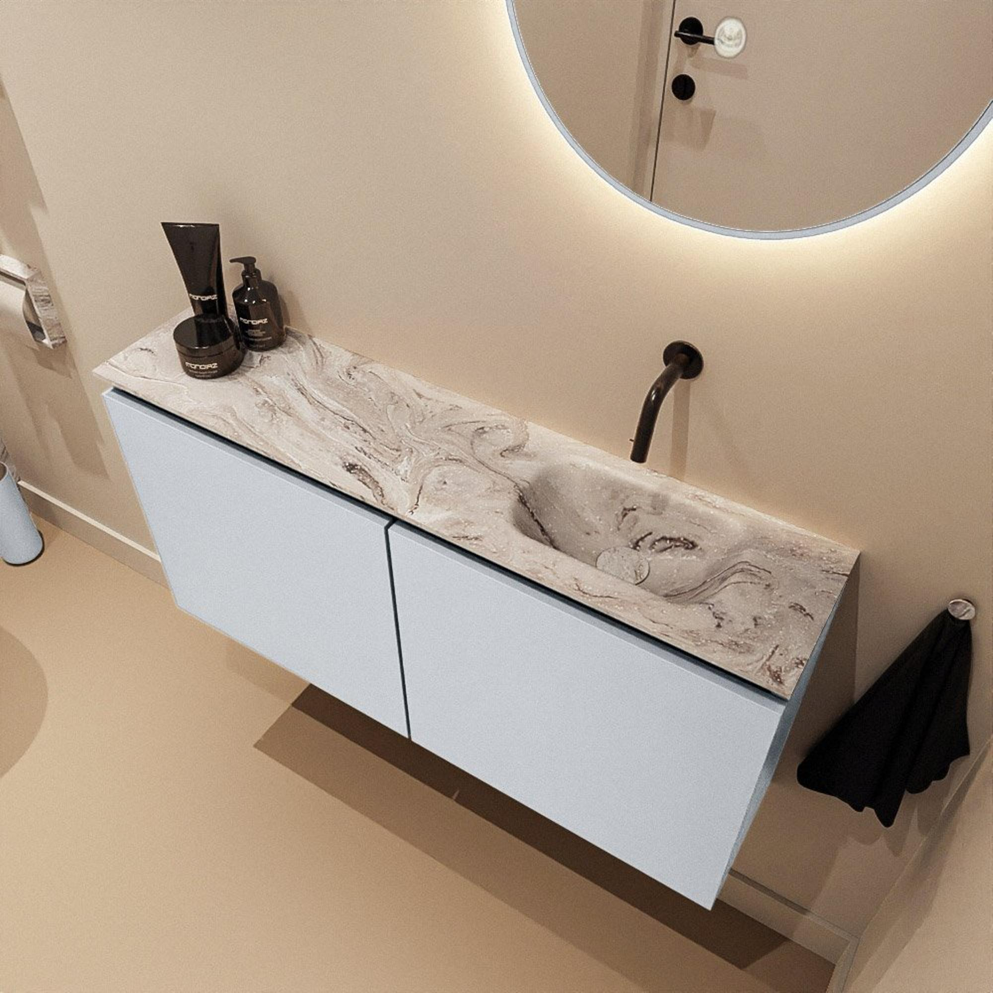 - Plan de toilette aspect marbre avec lavabo Eden pour une apparence luxueuse digne d’un hôtel.