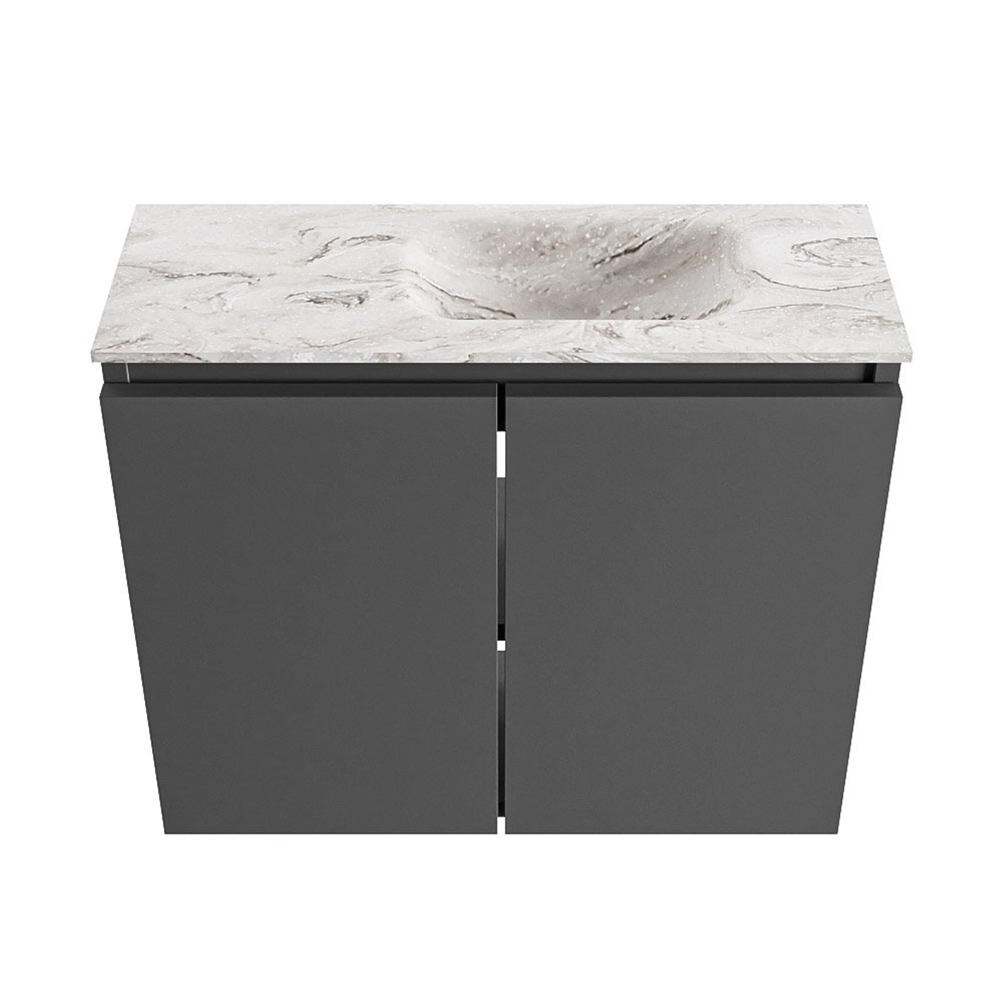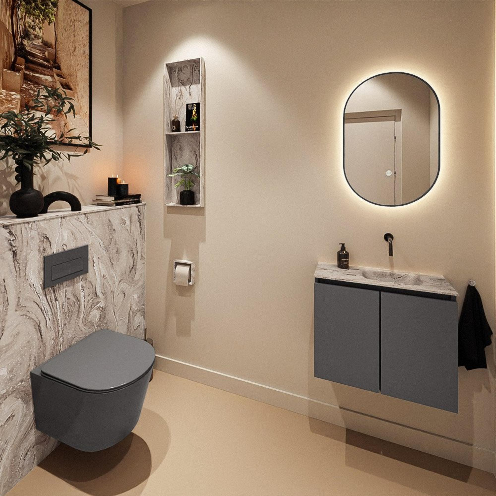 La combinaison du meuble Dark Grey avec le plan couleur marbre donne immédiatement une allure luxueuse à vos toilettes. Les façades sans poignées créent un ensemble épuré et minimaliste, sans pollution visuelle, donnant à votre salle de bains ou à vos toilettes un aspect moderne et haut de gamme. Le plan en Solid Surface avec effet marbre ressemble à de la pierre naturelle, mais il est plus doux et plus lisse au toucher. Cela le rend non seulement agréable à regarder, mais aussi confortable à utiliser au quotidien. Dans un intérieur moderne, cet ensemble s'intègre parfaitement, tandis que dans un style plus classique ou hôtel-chic, il apporte au contraire une touche contemporaine.