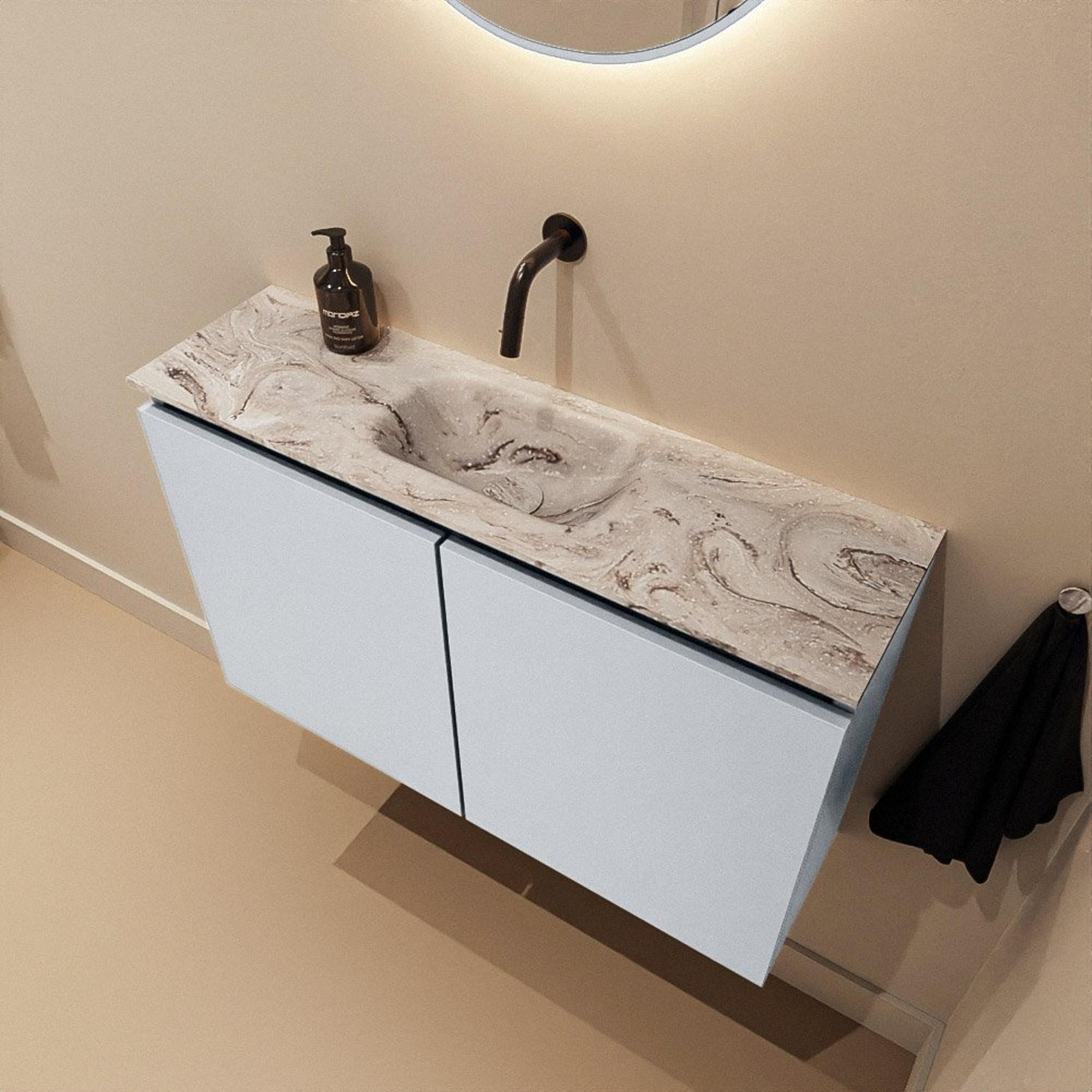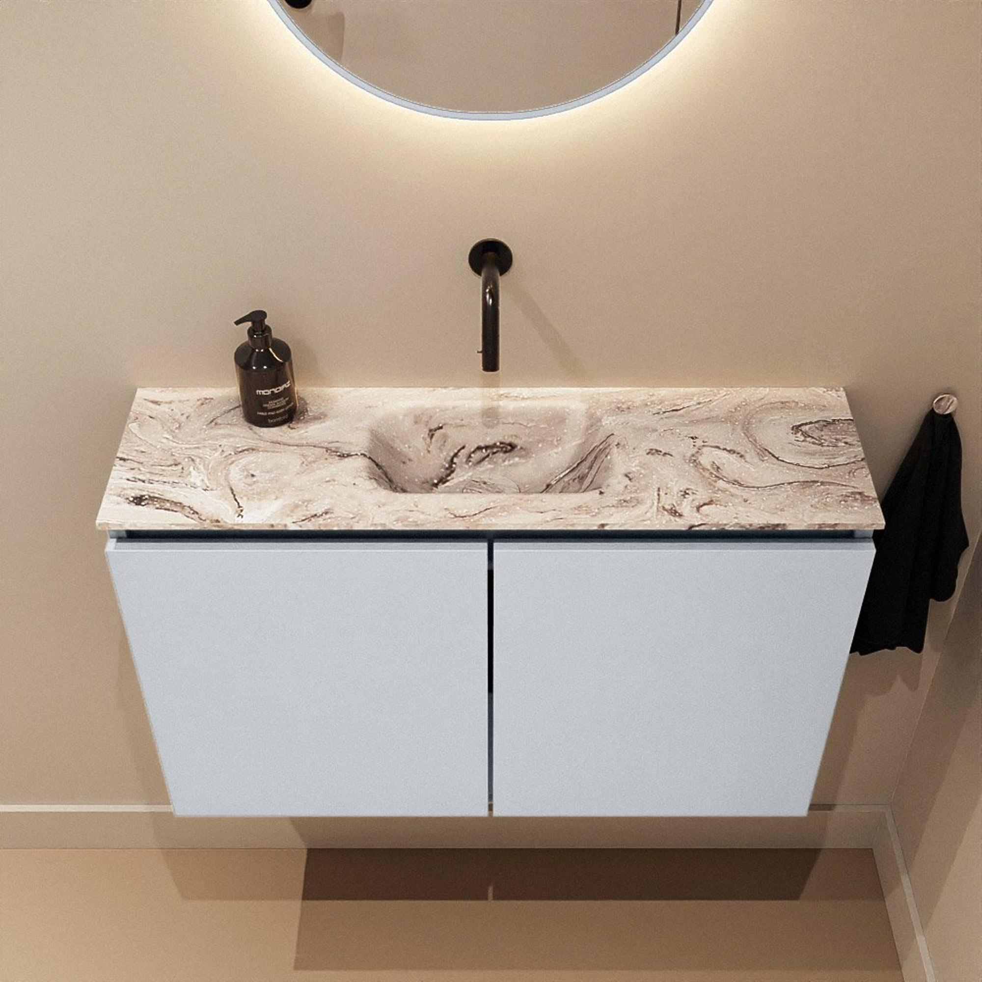 Jeu de couleurs moderne entre meuble Clay et plan vasque aspect marbre