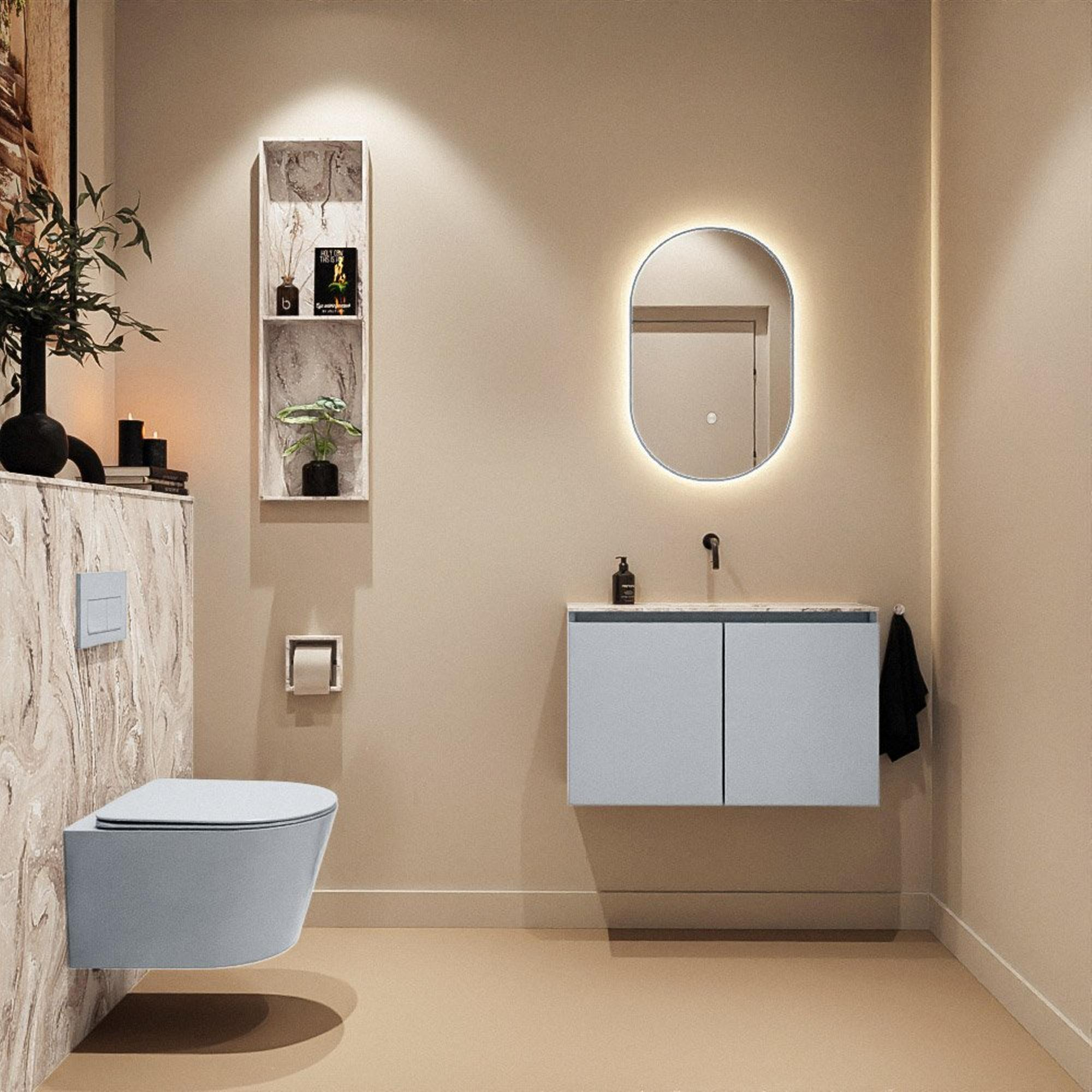 La teinte Clay est un gris moderne à l’allure chaleureuse et contemporaine. Combinée au plan de toilette couleur marbre et au lavabo Eden en Glace, elle crée un aspect luxueux qui apporte immédiatement de l’ambiance à vos toilettes. Le contraste entre le meuble gris doux et l’accent marbré clair confère une atmosphère chic digne d’un hôtel, sans être trop chargé. Grâce à cette palette de couleurs apaisante, ce meuble se marie facilement avec les tendances de carrelage populaires telles que l’effet béton, le terrazzo ou le motif en chevrons. Que vous optiez pour des robinets et accessoires noirs, chromés ou en métal brossé, vous pouvez affiner le style exactement comme vous le souhaitez.
