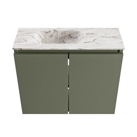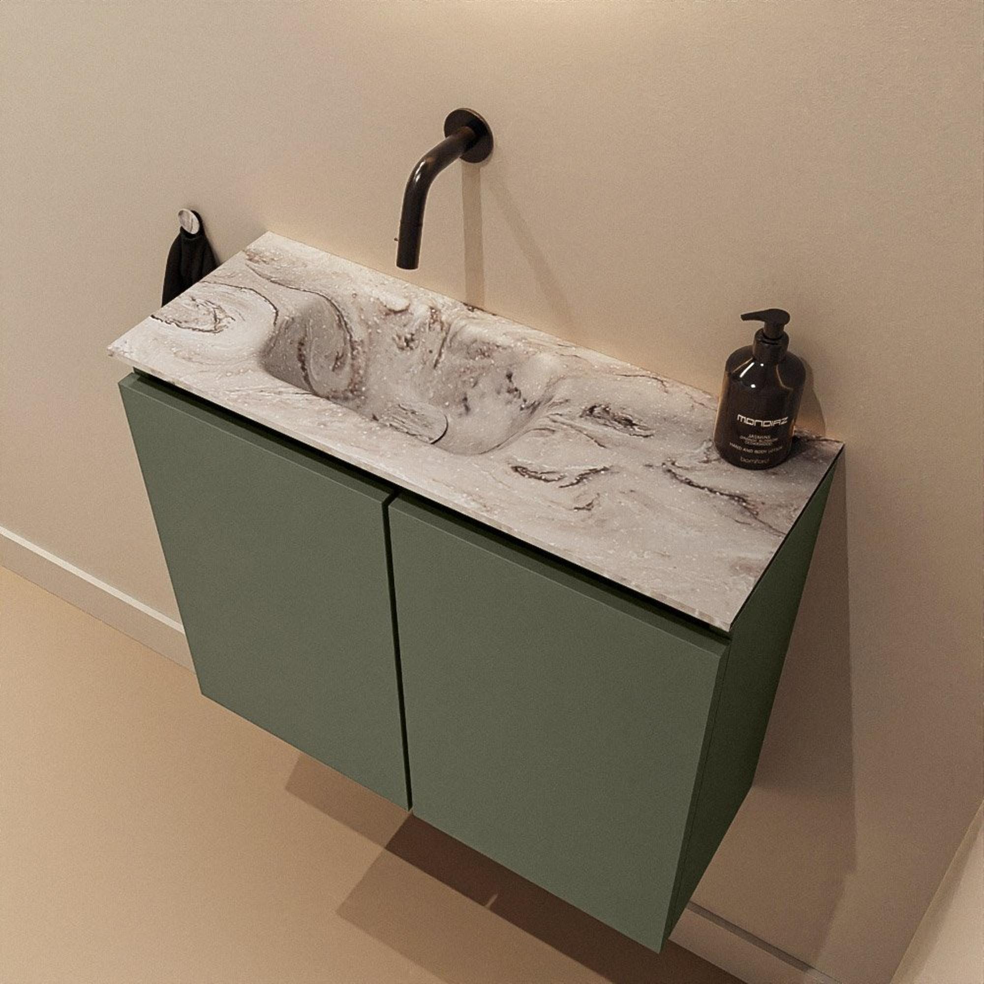 La combinaison du meuble vert Army et du lavabo Eden couleur marbre crée un look puissant et moderne. La teinte verte apporte chaleur et style, tandis que le lavabo aspect marbre ajoute une touche de luxe et de légèreté. Cela fait de ce meuble un excellent choix si vous souhaitez créer des toilettes modernes et orientées design sans qu’elles paraissent trop froides ou cliniques. Grâce à la façade sans poignées, la ligne reste épurée et minimaliste, ce qui s’accorde parfaitement avec les lignes droites, les accents noirs ou les robinets en laiton. Le lavabo est réalisé sans trou de robinet, afin que vous puissiez choisir vous-même un robinet à poser assorti et ainsi adapter totalement le style de vos toilettes à vos préférences.