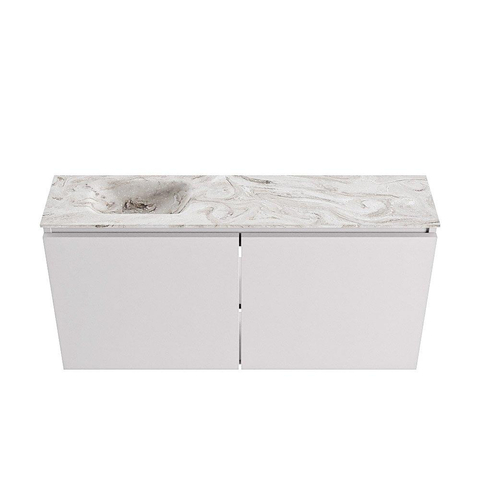 Avec la combinaison d’une couleur de corps grise (Cale) et d’un plan à l’aspect marbre dans la couleur Glace, ce meuble s’intègre parfaitement à un style moderne et minimaliste. Les lignes épurées, les portes sans poignées et la forme peu profonde donnent une impression d’espace plus grand, tout en vous offrant un meuble généreux le long du mur. Le lavabo EDEN en Solid Surface renforce la sensation de luxe : la surface mate offre un aspect calme et haut de gamme, ce qui permet de combiner parfaitement l’ensemble avec, par exemple, des robinets noir mat, chrome ou inox. Ce meuble révèle tout particulièrement son potentiel dans des toilettes au fini soigné ou dans une salle de bains compacte où vous souhaitez créer un look apaisant et harmonieux.