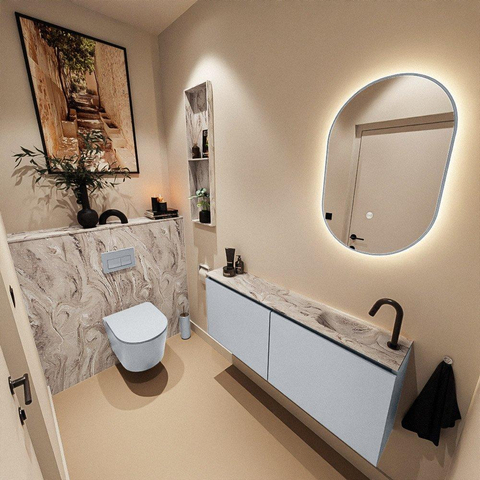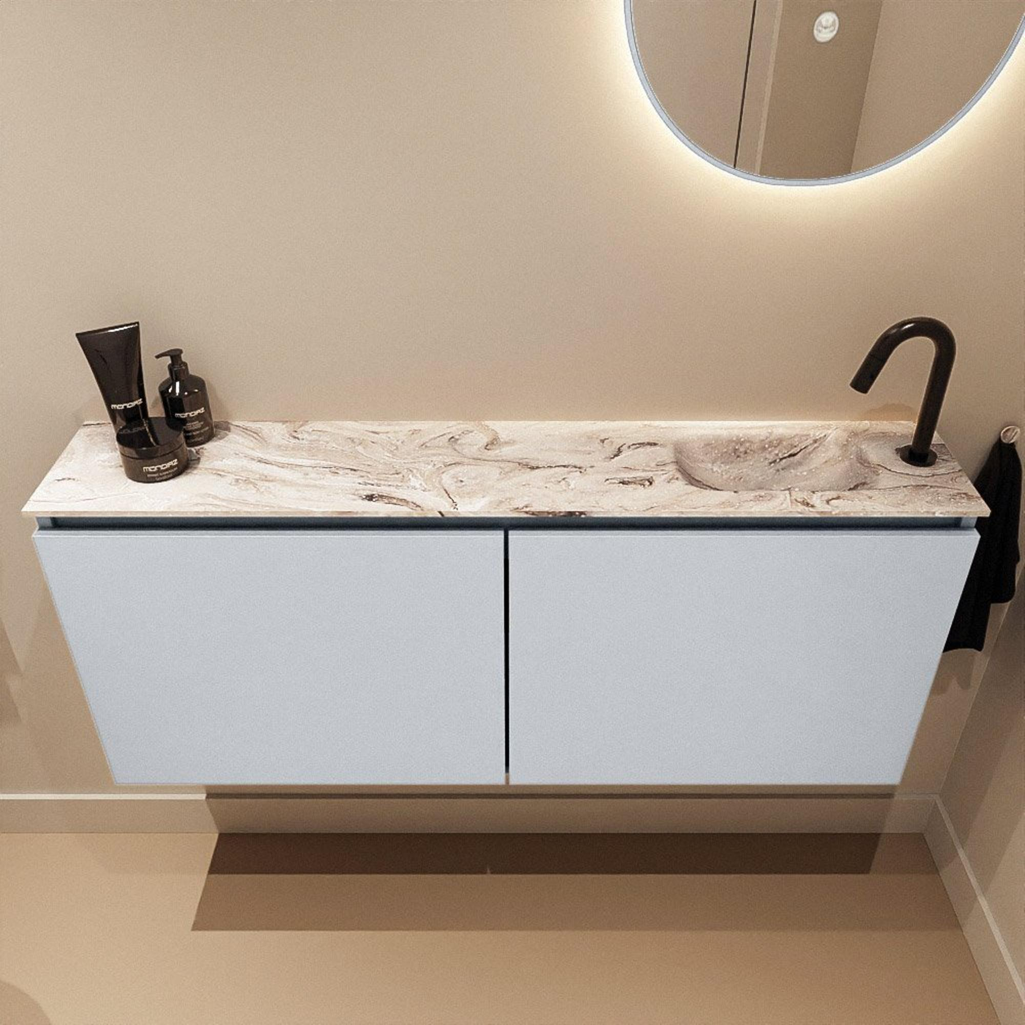 La combinaison du meuble couleur Clay avec le plan couleur marbre Glace donne immédiatement à vos toilettes une apparence moderne et haut de gamme. Clay est une teinte gris chaud qui se marie facilement avec des robinets noirs, des carreaux blancs ou au contraire des tons naturels riches. Le plan en aspect marbre y ajoute une atmosphère luxueuse, presque digne d’un hôtel, sans devenir tape-à-l’œil. Vous créez ainsi avec un seul meuble une base élégante autour de laquelle vous pouvez concevoir le reste de vos toilettes ou de votre salle de bains. Que vous optiez pour un look minimaliste avec des carreaux sobres ou au contraire pour un sol prononcé, ce meuble s’adapte sans effort à votre style.