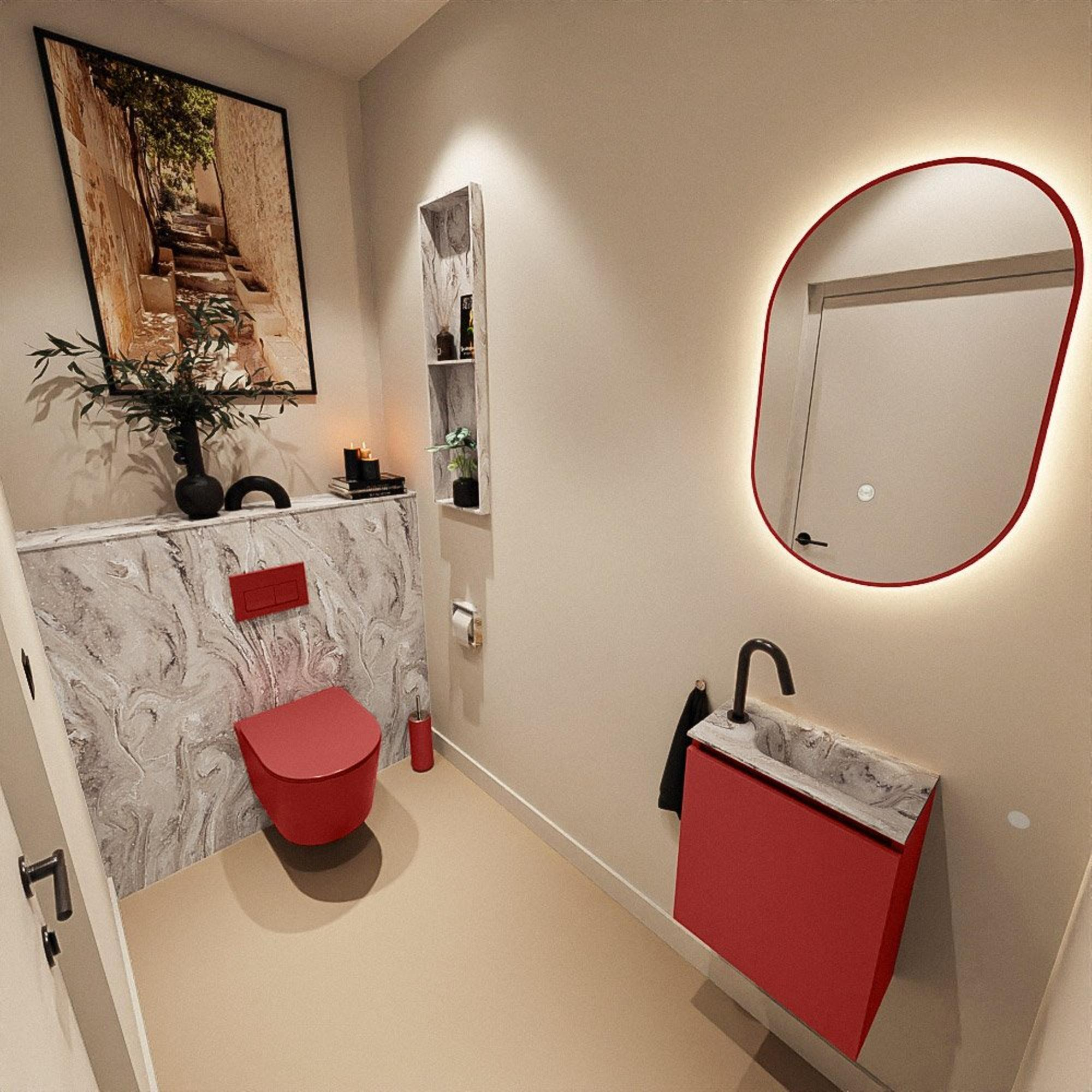 La couleur chaleureuse Fire confère au meuble un aspect affirmé et contemporain qui ajoute immédiatement du caractère à vos toilettes ou à votre salle de bains d’appoint. Combinée au plan de couleur marbre et au lavabo Eden, elle crée un contraste chic que l’on retrouve plutôt dans les salles de bains haut de gamme que dans un simple coin lave-mains. Les lignes épurées, la façade sans poignée et le lavabo en solid surface donnent à l’ensemble une allure minimaliste et moderne sans devenir froide. C’est précisément pour cela que vous pouvez associer ce meuble à merveille avec des robinets et des accessoires noirs, chromés ou en métal brossé, afin de créer un style cohérent et réfléchi dans tout votre espace sanitaire.