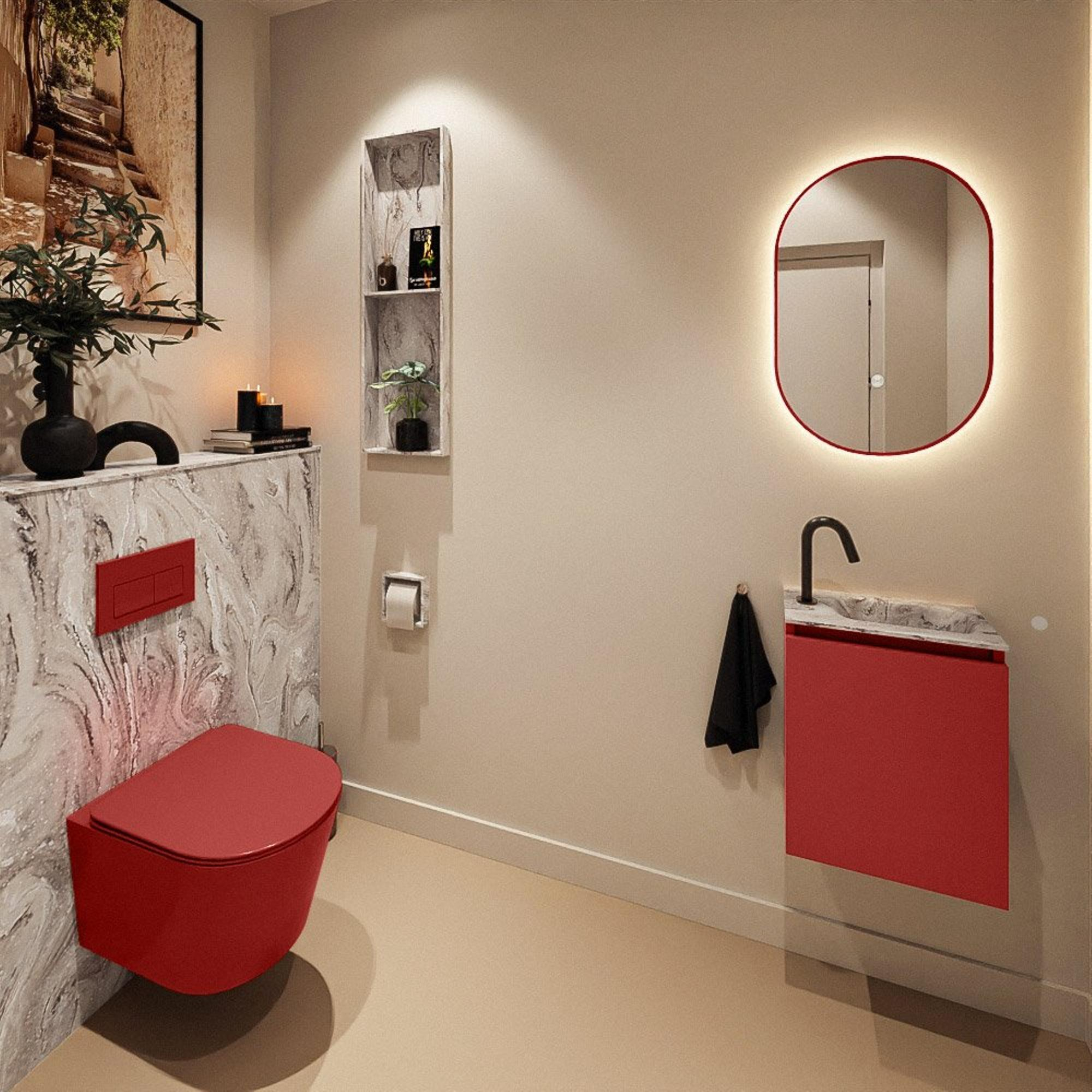 Vous recherchez un meuble WC compact et moderne qui apporte juste un peu plus d’allure à vos toilettes ou à votre petite salle de bains ? Cet ensemble combine un meuble-bas fin avec un lavabo épuré en solid surface, ce qui vous permet de vous laver les mains confortablement même dans un espace étroit, sans sensation d’exiguïté. La faible profondeur en fait une solution idéale pour des toilettes séparées, une salle de bains d’appoint ou une niche étroite, tandis que le lavabo aspect marbre et le rouge chaleureux du meuble créent immédiatement une ambiance luxueuse. Grâce au trou de robinet à droite, ce modèle s’adapte parfaitement lorsque vos arrivées d’eau ou votre passage l’exigent. Avec sa façade sans poignée, l’ensemble reste sobre et minimaliste, et vous pouvez combiner ce meuble sans effort avec d’autres produits sanitaires modernes dans le même style.