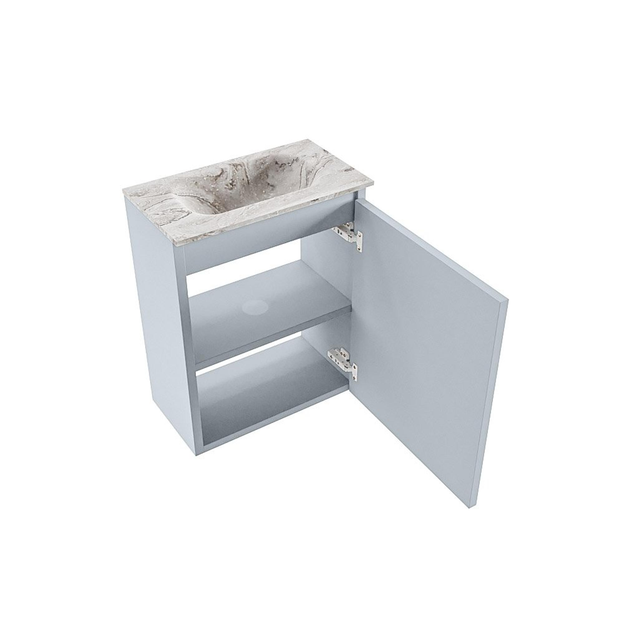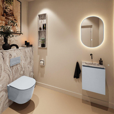 La teinte gris douce clay donne à vos toilettes une apparence chaleureuse et moderne, intemporelle et facile à associer à d’autres matériaux. Le plan en solid surface effet marbre avec lavabo intégré Eden Glace apporte une touche finale luxueuse : des lignes épurées, mais avec l’aspect subtilement raffiné de la pierre naturelle. Cette combinaison s’accorde à merveille avec les salles de bains modernes, scandinaves et de style hôtel chic. Grâce aux façades sans poignées, le jeu de lignes reste calme et épuré, ce qui donne au meuble un aspect haut de gamme malgré son format compact. C’est un très bon choix si vous souhaitez offrir à vos invités une impression soignée ou apporter un supplément de luxe à votre routine quotidienne.
