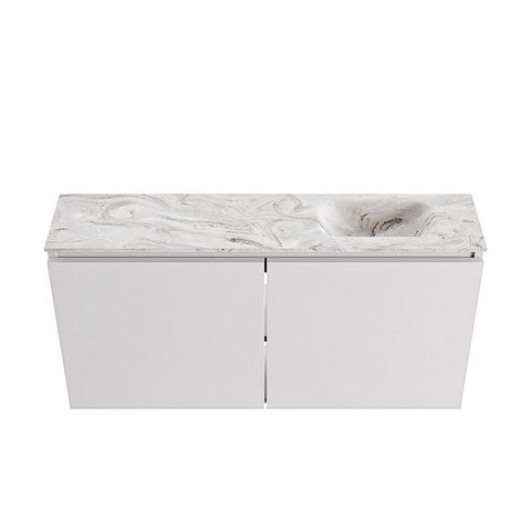 Avec une largeur de 100 cm et une profondeur de seulement 23 cm, ce meuble de toilettes est spécialement conçu pour les espaces étroits, comme un WC ou une petite salle de bains. Les portes sans poignée assurent un aspect plus épuré et rendent l’ensemble visuellement encore plus fin. La combinaison de la couleur grise Cale avec le plan aspect marbre et le lavabo Glace s’accorde parfaitement avec un style moderne ou hôtel chic. En plaçant le lavabo à droite, vous exploitez au mieux le mur et évitez les collisions avec une porte ou les toilettes. Vous créez ainsi un aménagement fonctionnel et bien pensé, sans faire de concessions sur le design.