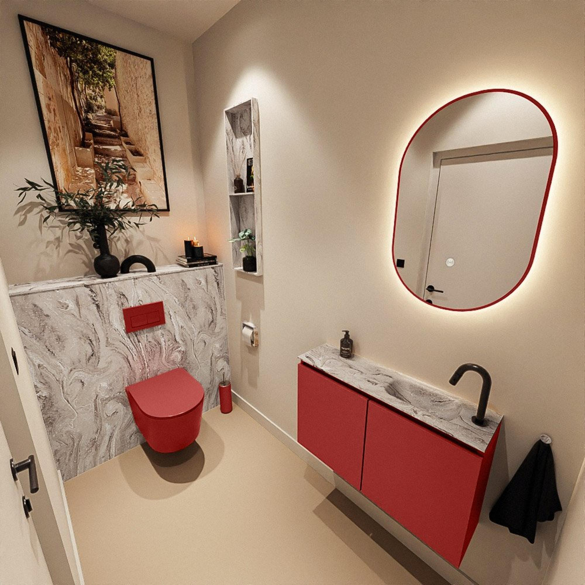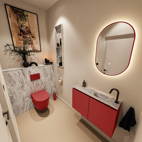 La chaleureuse couleur Fire confère au meuble une allure puissante et contemporaine qui apporte immédiatement du caractère à vos toilettes. En combinaison avec le plan en solid surface à l’aspect marbre, il crée une atmosphère luxueuse, presque digne d’un hôtel, surtout si vous l’associez à un joli robinet mural ou à un robinet surélevé et élancé. Les façades modernes sans poignées s’accordent parfaitement avec les intérieurs minimalistes et laissent vraiment s’exprimer la couleur. Cette combinaison se prête parfaitement aux salles de bains modernes et industrielles, mais aussi comme accent marquant dans une pièce par ailleurs calme et neutre. Vous faites ainsi d’un petit WC une véritable carte de visite particulière pour votre maison.