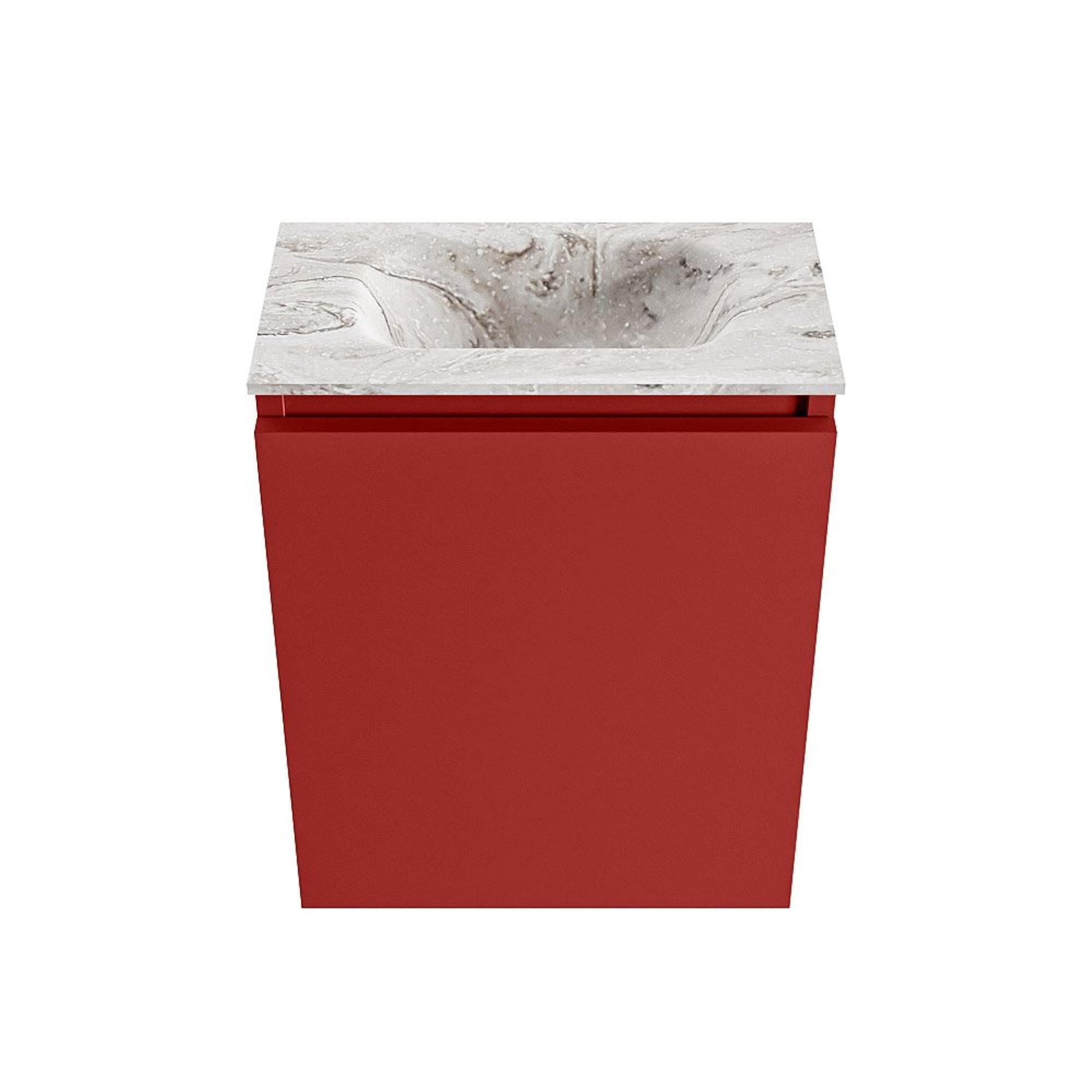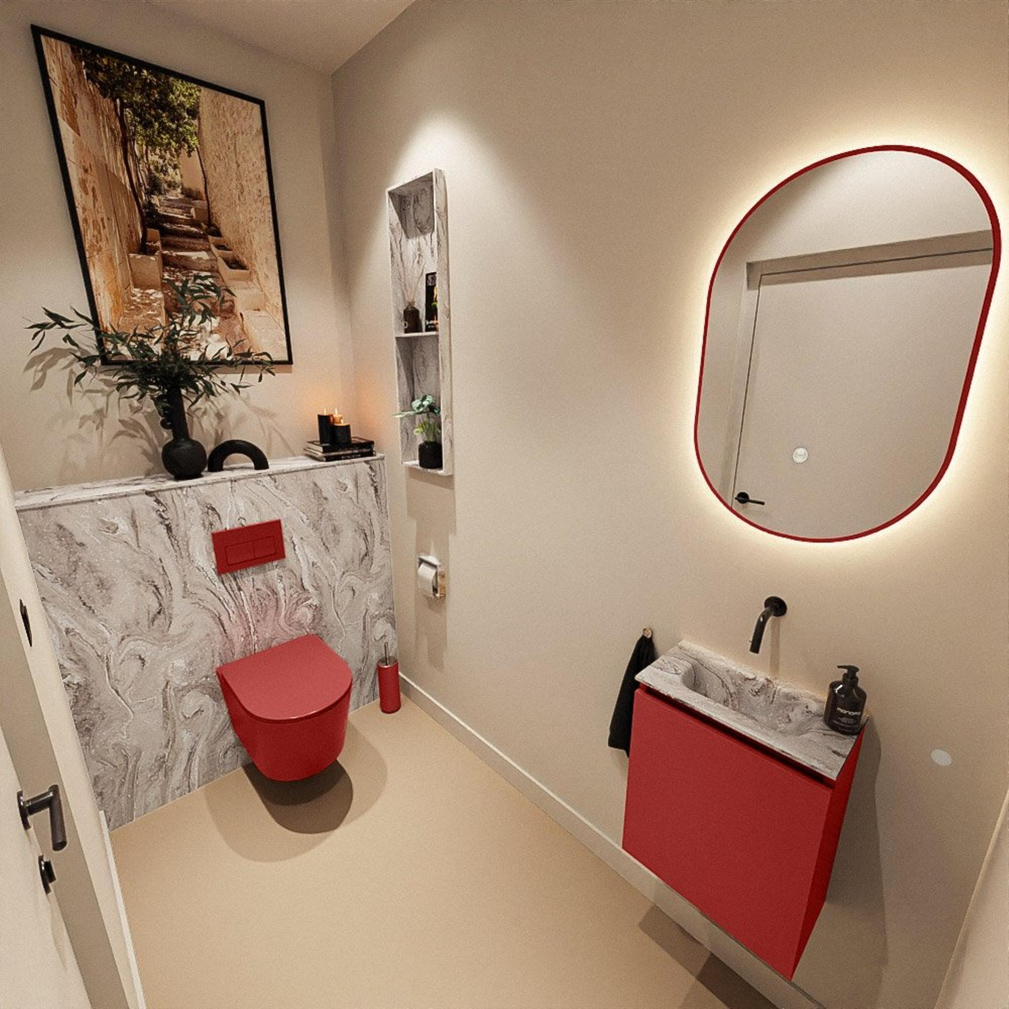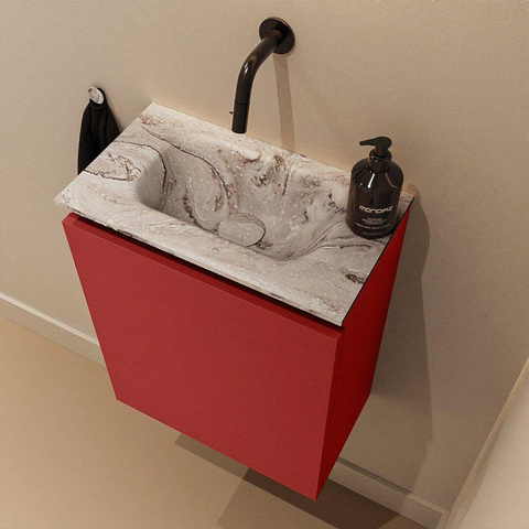 Vous recherchez un meuble de WC compact et en même temps luxueux, qui prend peu de place mais qui affiche un grand design ? Alors cette combinaison d’un meuble aux lignes épurées avec un lavabo aspect marbre est un choix judicieux. Grâce à sa faible profondeur, il s’intègre parfaitement dans un petit WC ou une salle de bains étroite, tandis que la couleur Fire accrocheuse apporte immédiatement ambiance et chaleur. La porte sans poignée et les lignes modernes créent une apparence calme et luxueuse, idéale si vous souhaitez créer un look propre et ordonné. Le lavabo de couleur marbre avec cuve au centre complète l’ensemble : élégant, pratique et prêt à être combiné avec un robinet mural et des accessoires assortis, par exemple en noir ou en laiton. Ainsi, même le plus petit WC devient un ensemble bien pensé et confortable.