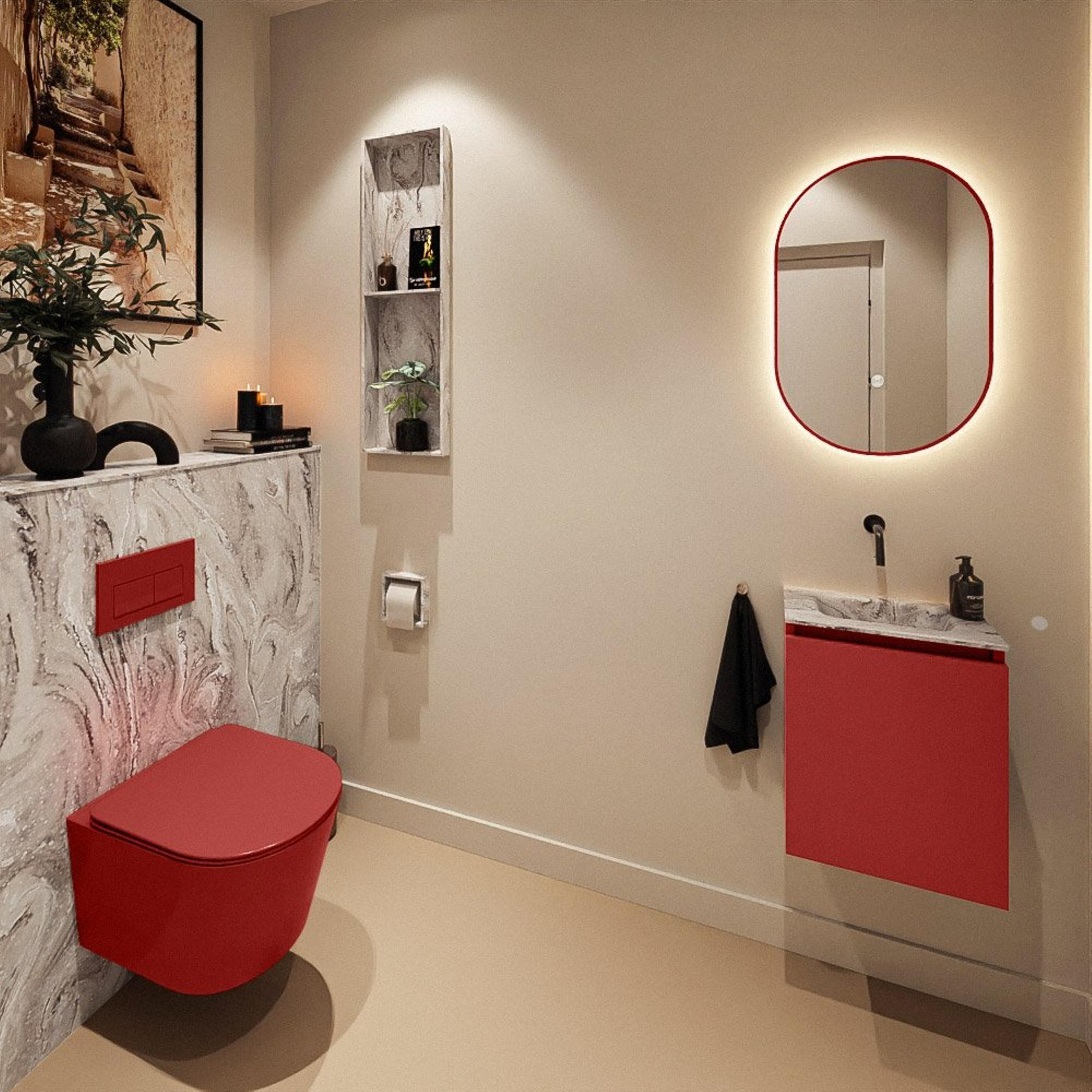 Avec sa largeur de 40 cm et sa faible profondeur de 23 cm, ce meuble est spécialement conçu pour les petits espaces, sans faire de compromis sur l’esthétique. La teinte chaude Fire du meuble forme un contraste saisissant avec le plan et le lavabo de couleur marbre, donnant immédiatement à vos toilettes une atmosphère d’hôtel de luxe. Les façades modernes sans poignées gardent l’ensemble calme et épuré, de sorte que l’espace paraît optiquement plus grand. Cela rend l’ensemble particulièrement adapté si vous souhaitez donner à un petit WC une apparence haut de gamme et axée sur le design, sans que cela ne paraisse chargé ou encombré.