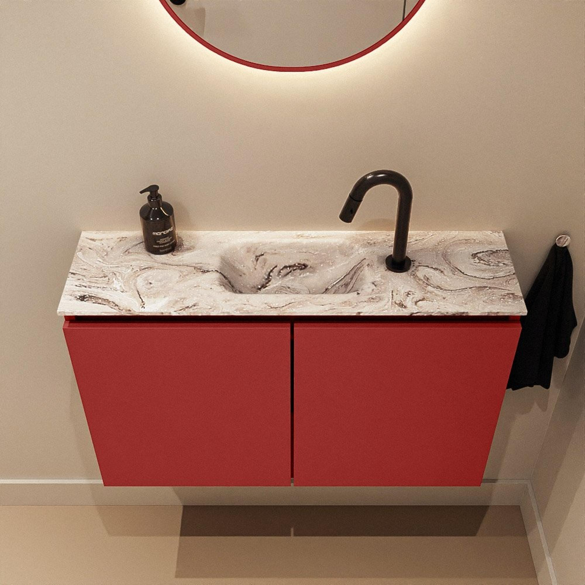 La couleur rouge profond Fire donne immédiatement du caractère à vos toilettes et fait de la zone du lavabo un point focal élégant. Combinée au plan de couleur marbre et au lavabo clair Glace, elle crée une apparence chic et contemporaine qui s’accorde parfaitement avec des carreaux modernes et des robinets noirs, chromés ou en laiton. La façade sans poignées offre un aspect calme et minimaliste et met en valeur les lignes épurées du meuble. Il se combine ainsi facilement avec d’autres meubles de salle de bains modernes ou accessoires. Que vous visiez une ambiance chaleureuse d’hôtel avec des carreaux sombres ou que vous souhaitiez au contraire créer un look ludique et coloré, avec cette combinaison de couleurs marquante vous faites une déclaration de design qui restera belle longtemps.