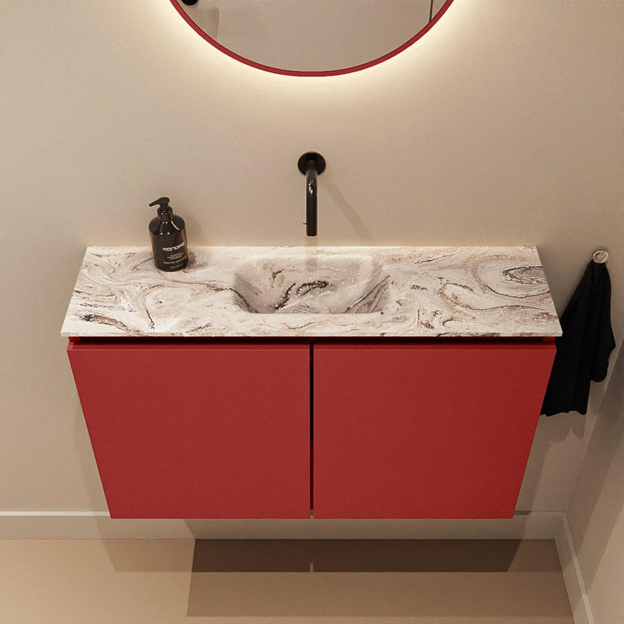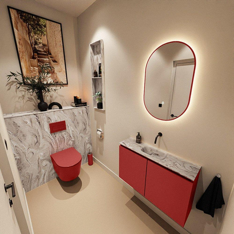 Vous recherchez un meuble de toilettes remarquable mais compact, qui s’intègre parfaitement dans des toilettes modernes ou une petite salle de bains, sans faire de concessions sur la qualité et l’esthétique ? Ce meuble combine un caisson bas, droit et peu profond, avec un lavabo élégant en version solide, idéal pour les espaces où chaque centimètre compte. La chaude couleur rouge du meuble crée un contraste raffiné avec le plan vasque à l’aspect marbre, ce qui confère immédiatement à vos toilettes une apparence luxueuse et personnalisée. Grâce à la position centrale du lavabo et aux façades sans poignées, l’ensemble paraît sobre et minimaliste, tout en offrant un point d’eau pratique, adapté à un usage quotidien en famille, mais aussi parfait comme élément accrocheur dans des toilettes invités.