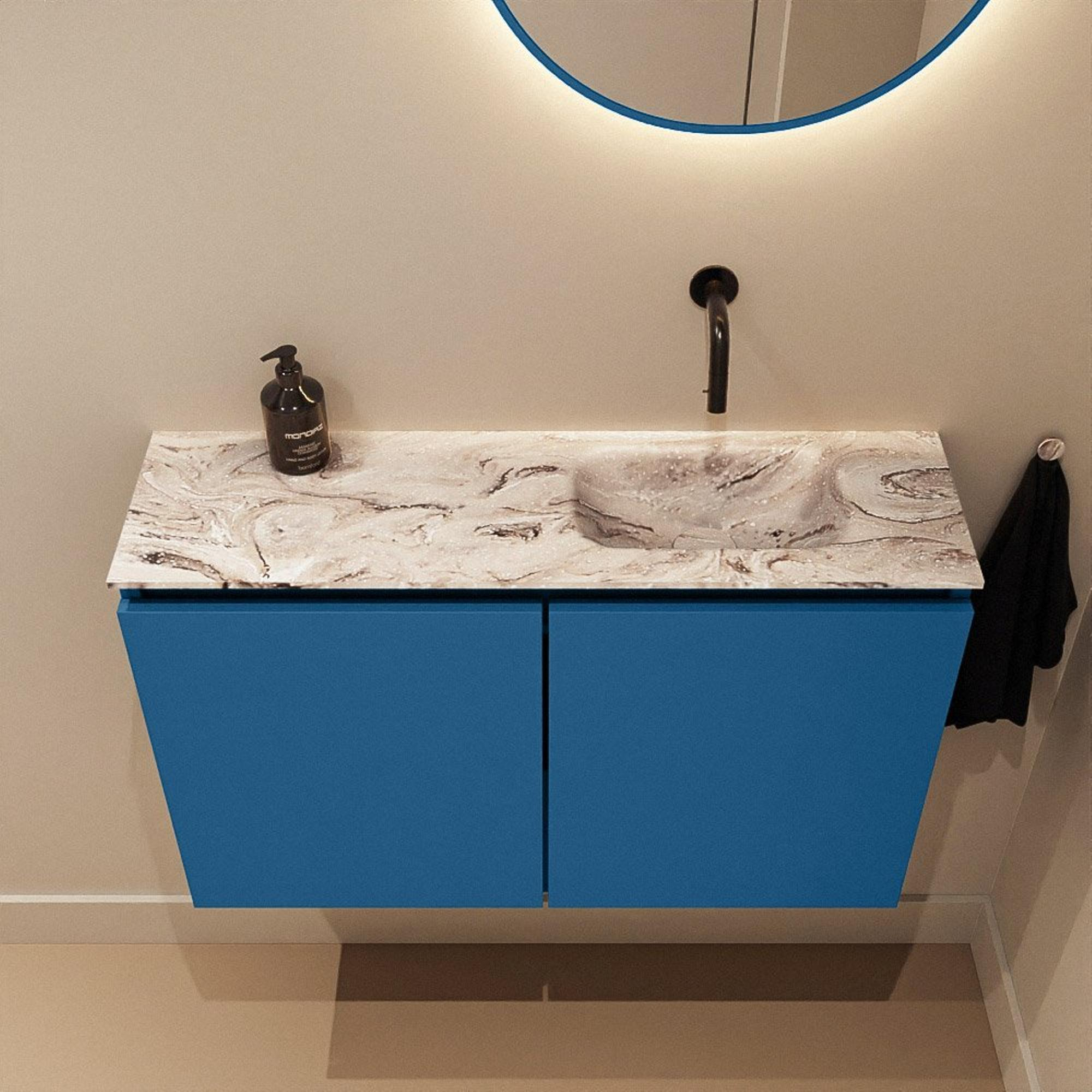Le meuble dans la couleur Jeans – une teinte de bleu contemporaine – donne immédiatement à vos toilettes une allure digne d’un véritable intérieur. En combinaison avec le plan en Solid Surface couleur marbre, il en résulte un look chic, presque digne d’un hôtel, sans que cela devienne trop chargé ou tape-à-l’œil. Les veines discrètes de l’effet marbre s’accordent parfaitement avec des carreaux modernes dans des tons blancs, gris ou sable, mais créent aussi un contraste intéressant avec un mur sombre ou coloré. Grâce à la façade sans poignées, l’apparence reste épurée et minimaliste ; idéal si vous aimez un style de salle de bains moderne et ordonné dans lequel les lignes et les matériaux jouent le rôle principal.