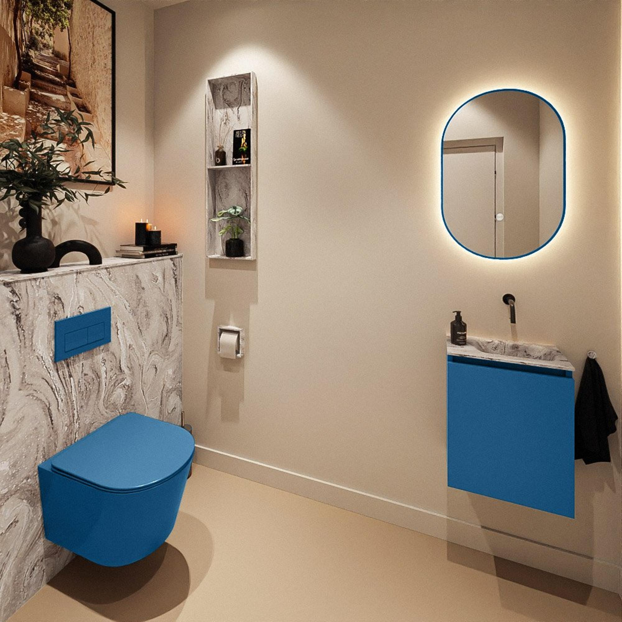 Look moderne et élégant en bleu Jeans et plan vasque effet marbre