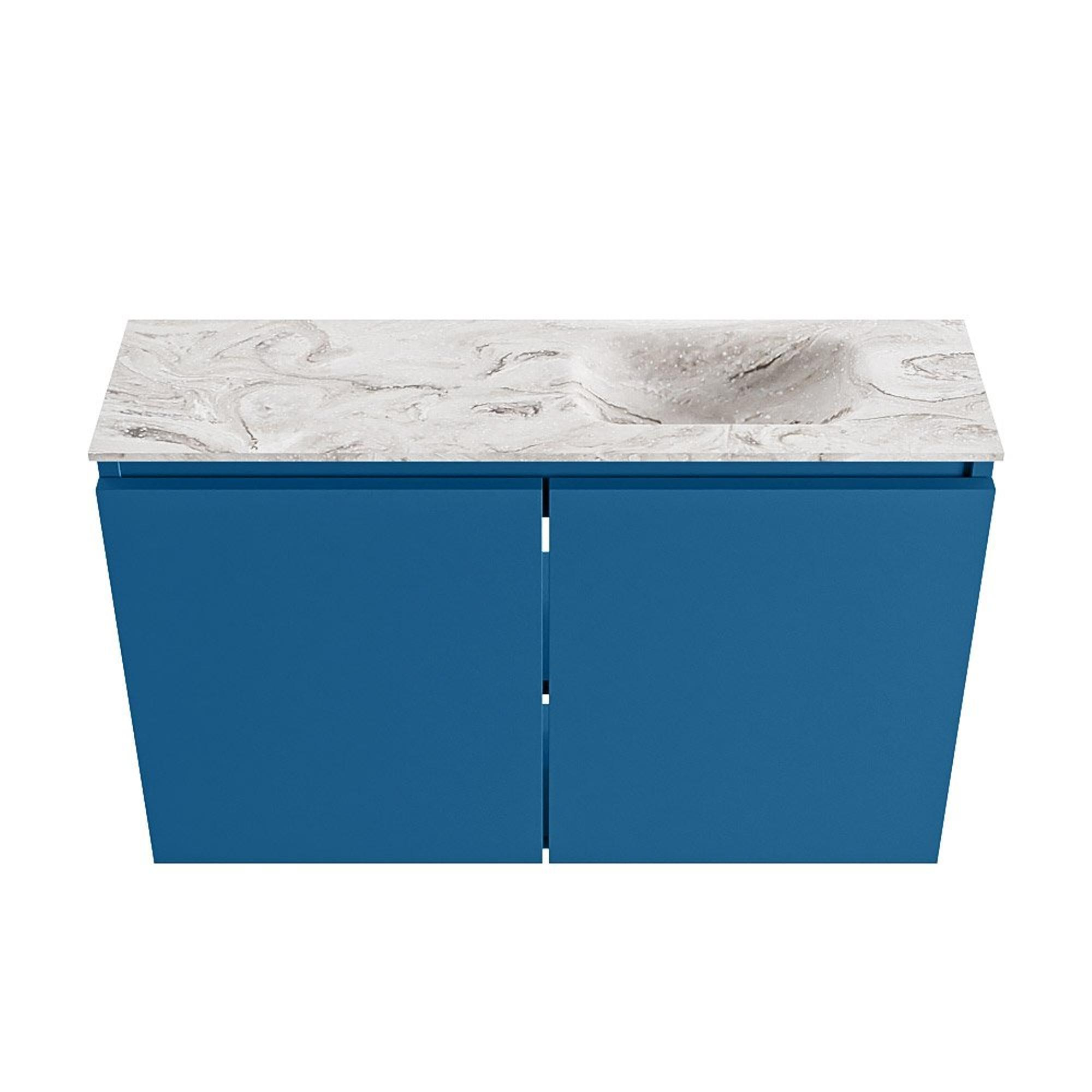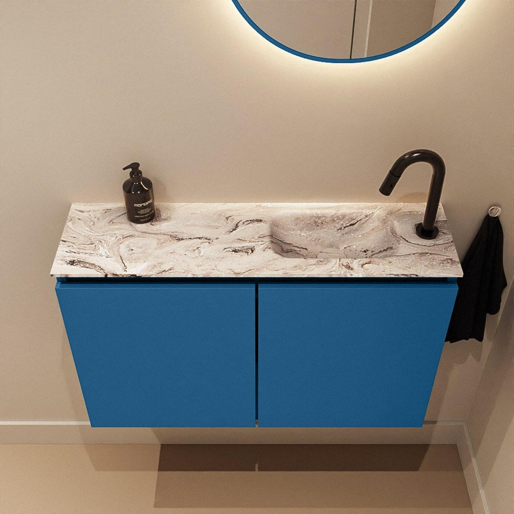 - Couleur de meuble bleu Jeans moderne avec plan de couleur marbre pour une allure luxueuse.