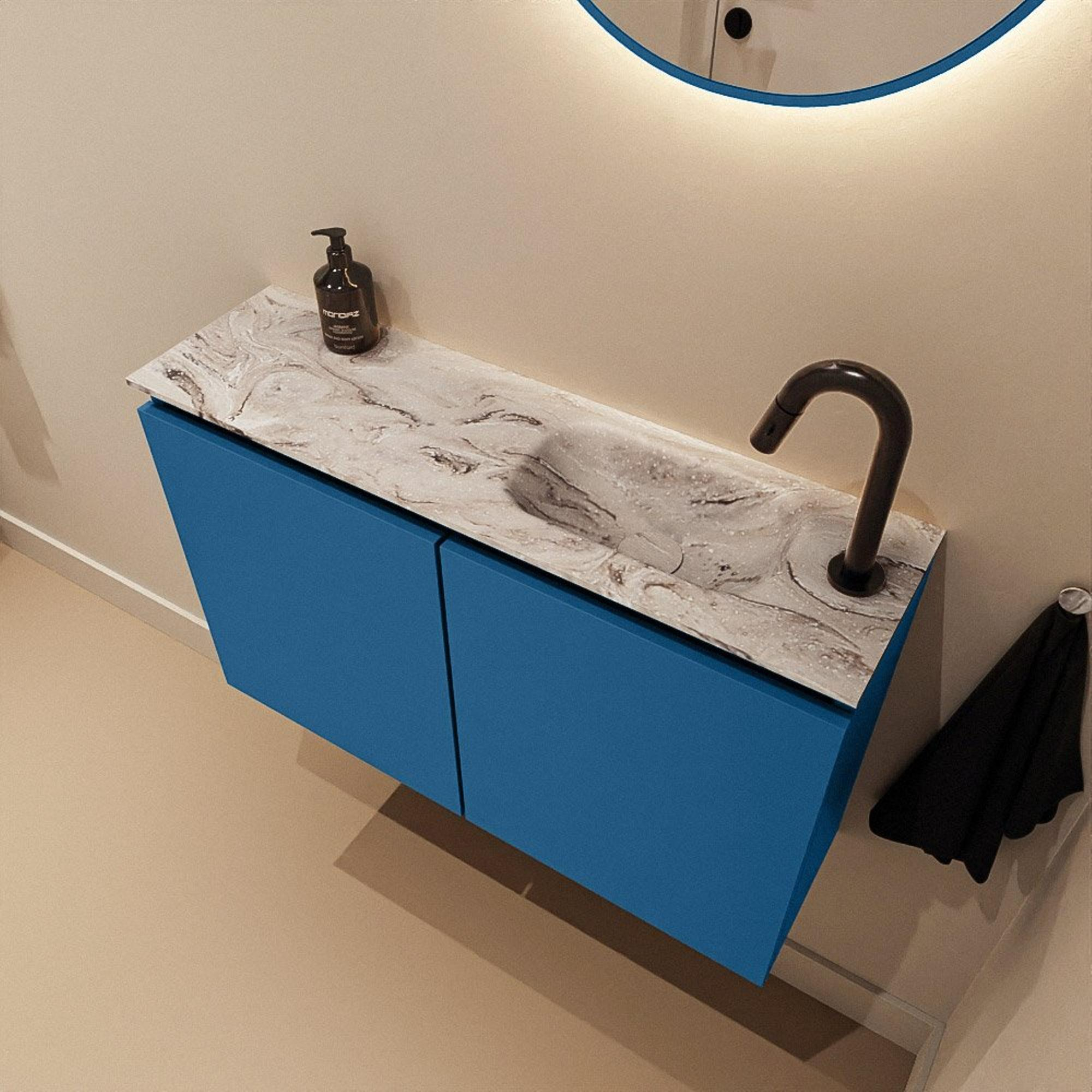 La couleur Jeans moderne du meuble donne immédiatement du caractère à vos toilettes : contemporaine, chaleureuse et un peu différente des teintes blanches ou bois standard. Combinée au plan de couleur marbre et au lavabo Glace, elle crée une allure luxueuse, presque digne d’un hôtel, qui s’intègre parfaitement dans les salles de bains modernes et design. Le jeu de lignes épuré et les façades sans poignées assurent un ensemble sobre, sans nuisance visuelle, donnant à la pièce une impression de grandeur et d’ordre. Cette combinaison se marie facilement avec des robinets et accessoires noirs, chromés ou en métal brossé, ce qui vous permet de créer aisément un style cohérent. Que vous souhaitiez un look minimaliste et scandinave ou au contraire une ambiance boutique chic, cette combinaison de couleurs vous offre une base solide.