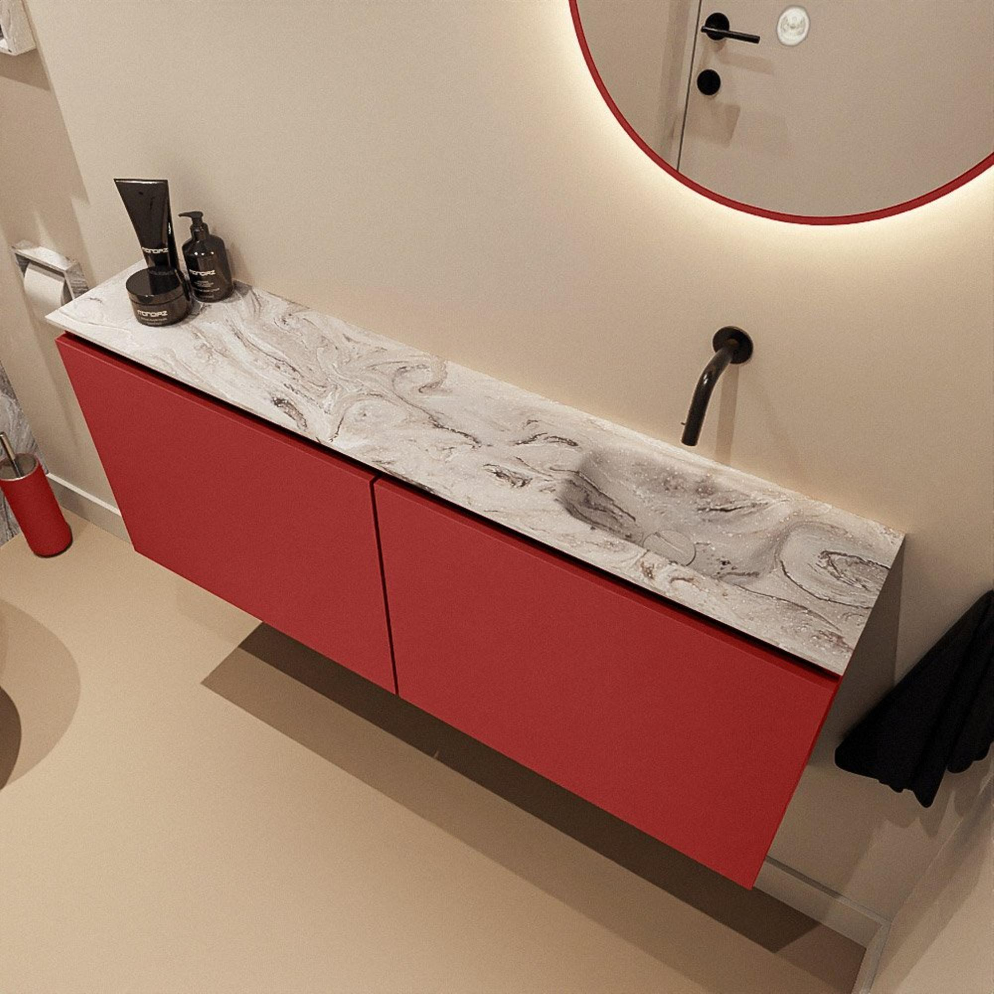La couleur Fire, rouge profond et chaleureuse, donne immédiatement à vos toilettes une allure luxueuse et affirmée. En combinaison avec le plan de couleur marbre et le lavabo Eden en Glace, il se crée un contraste chic qui se marie à merveille avec des robinets modernes et des accessoires noirs mats, dorés ou en inox. Les façades sans poignées renforcent le look minimaliste : aucune interruption, seulement des lignes épurées et une façade sobre. Ainsi, ce meuble se combine sans effort aussi bien avec des carreaux clairs et discrets qu’avec des revêtements muraux sombres et plus marqués. Si vous cherchez un meuble qui soit plus que purement fonctionnel, mais qui ajoute vraiment de l’ambiance et de la personnalité, cette combinaison est un excellent choix.