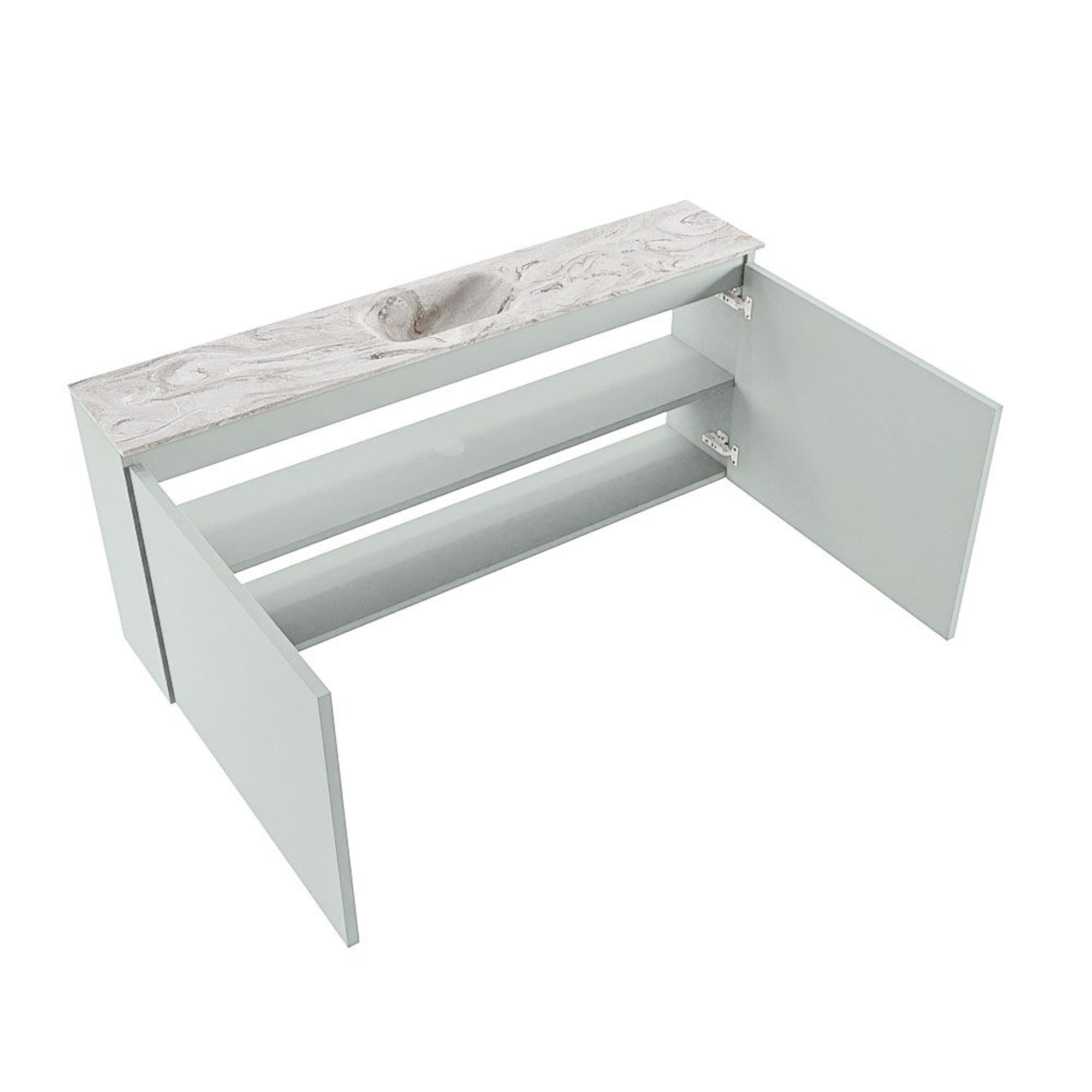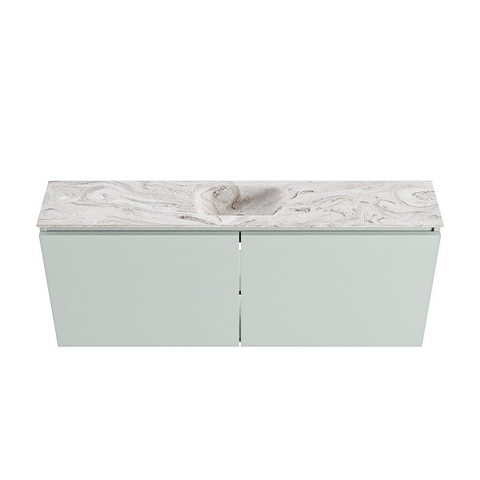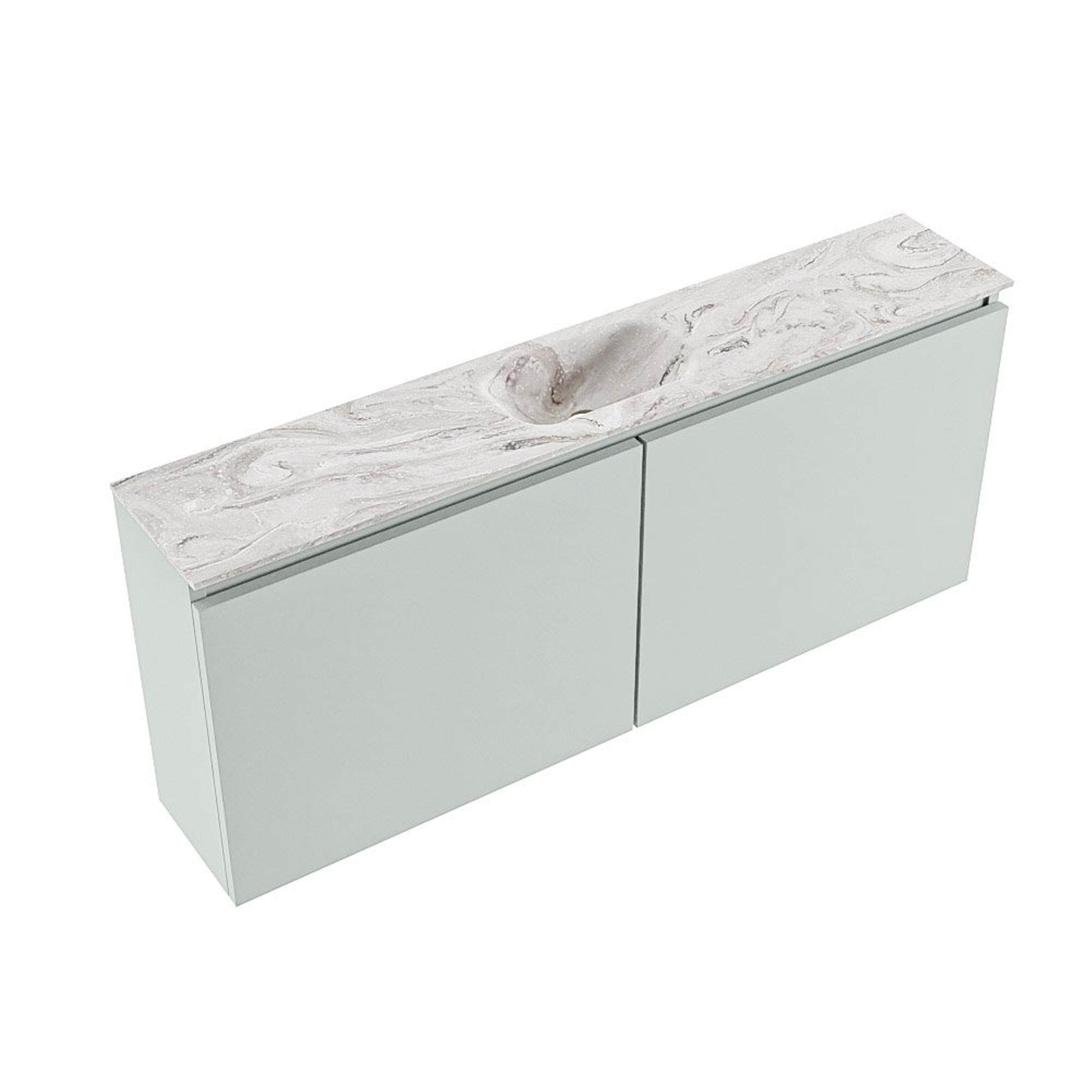 La couleur Greey donne au meuble un aspect moderne, calme et en même temps original. Ce n’est pas un blanc ou un ton bois standard, mais une teinte vert doux qui se marie à merveille avec une grande variété de couleurs et de motifs de carrelage. Le plan de couleur marbre et le lavabo Eden créent un ensemble luxueux qui rappelle les hôtels de design. Grâce à la façade sans poignées, l’avant du meuble paraît épuré et minimaliste, ce qui est idéal si vous souhaitez un espace toilette ordonné et axé sur le design. Combinez le meuble avec un robinet noir mat, chromé ou en métal brossé pour renforcer encore le style. Vous transformez ainsi un lieu purement fonctionnel en véritable accroche-regard.