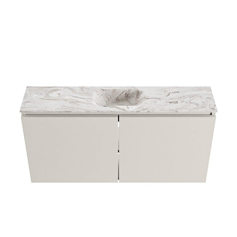 - Meuble couleur lin chaleureuse avec plan moderne aspect marbre pour une allure élégante et contemporaine.